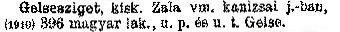 Nyilvános 2081 | 5715 | Cím: Révai nagy lexikona | Alcím: az ismeretek enciklopédiája Kiadás: Budapest : Révai testvérek, [1911]- Kötetei: 1. köt., A - Arany 2. köt., Arány - Beke 3. köt., Béke - Brutto 4. köt., Bratus - Csát 5. köt., Csata - Duc 6. köt., Duc - Etele 7. köt., Stelka - Földöv 8. köt., Földpálya - Gres 9. köt., Gréc - Herold 10. köt., Hérold - Jób 11. köt., Jób - Nontur 12. köt., Kontúr - Lovas 13. köt., Lovas - Mons 14. köt., Mens - Ottó 15. köt., Ottó - Racine 16. köt., Racine - Sodoma 17. köt., Sodoma - Tarján 18. köt., 19. köt., Vár - Zsüri | Kiegészítés Aachen - Beöthy 20. köt., Kiegészítés: Bér - Zsolt ETO jelzet: 03=945.11 Szakjelzet: 030 Cutter: R 62 Nyelv: magyar GELSESZIGET Gelsesziget, kisk. Zala vm. kanizsai j.-ban, (1910) 396 magyar lak., u. p. és u. t. Gelse. |