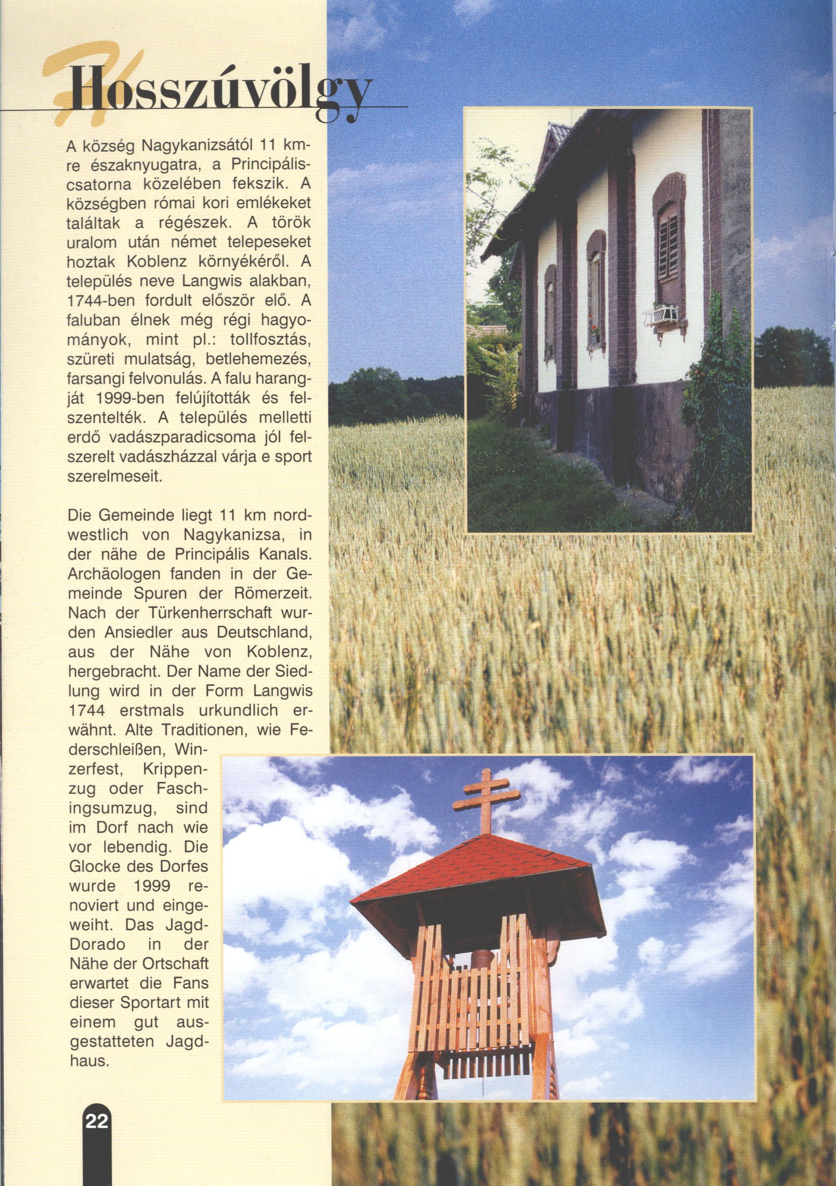 Nyilvános 2082 | 5557 | Rövid leírás | Teljes leírás (1.28 KB) | Hosszúvölgy Die Gemeinde liegt 11 km nordwestlich von Nagykanizsa, in der nähe de Principális Kanals. Archäologen fanden in der Gemeinde Spuren der Römerzeit. Nach der Türkenherrschaft wurden Ansiedler aus Deutschland, aus der Nähe von Koblenz, hergebracht. Der Name der Siedlung wird in der Form Langwis 1744 erstmals urkundlich erwähnt. Alte Traditionen, wie Federschleißen, Winzerfest, Krippenzug oder Faschingsumzug, sind im Dorf nach wie vor lebendig. Die Glocke des Dorfes wurde 1999 renoviert und eingeweiht. Das Jagd-Dorado in der Nähe der Ortschaft erwartet die Fans dieser Sportart mit einem gut ausgestatteten Jagdhaus. Dieses Text stammt von: Titel: Hívogató a Régiók Kapujában - Útikönyv Látnivalók Nagykanizsán és Térségében (Einladend in dem Tor des Gebiets - Reisebuch - Sehenswürdigkeiten in Nagykanizsa und Umgebung) Herausgegeben von: Nagykanizsa és a Környező Települések Területfejlesztési Társulása (Verein für Gebietsentwicklung in Nagykanizsa und in ihrer Umgebung) 8800 Nagykanizsa, Petőfi Sándor út 5. Tel.: 06 93/536-453 • 06 93/536-454 Tel ./Fax: 06 93/326-323 E-mail: terstars@axelero.hu www.kanizsaterseg.celodin.hu |