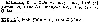Nyilvános 2163 | 5819 | Kilimán | kisk. Zala vármegye nagykanizsai járásában, (1910) 387 magyar lak.; u. p. és u. t. Gelse. Kilimán kisk. Zala vm., (1920) 435 lak. Cím: Révai nagy lexikona Alcím: az ismeretek enciklopédiája Kiadás: Budapest : Révai testvérek, [1911]- Kötetei: 1. köt., A - Arany 2. köt., Arány - Beke 3. köt., Béke - Brutto 4. köt., Bratus - Csát 5. köt., Csata - Duc 6. köt., Duc - Etele 7. köt., Stelka - Földöv 8. köt., Földpálya - Gres 9. köt., Gréc - Herold 10. köt., Hérold - Jób 11. köt., Jób - Nontur 12. köt., Kontúr - Lovas 13. köt., Lovas - Mons 14. köt., Mens - Ottó 15. köt., Ottó - Racine 16. köt., Racine - Sodoma 17. köt., Sodoma - Tarján 18. köt., 19. köt., Vár - Zsüri | Kiegészítés Aachen - Beöthy 20. köt., Kiegészítés: Bér - Zsolt ETO jelzet: 03=945.11 Szakjelzet: 030 Cutter: R 62 Nyelv: magyar |