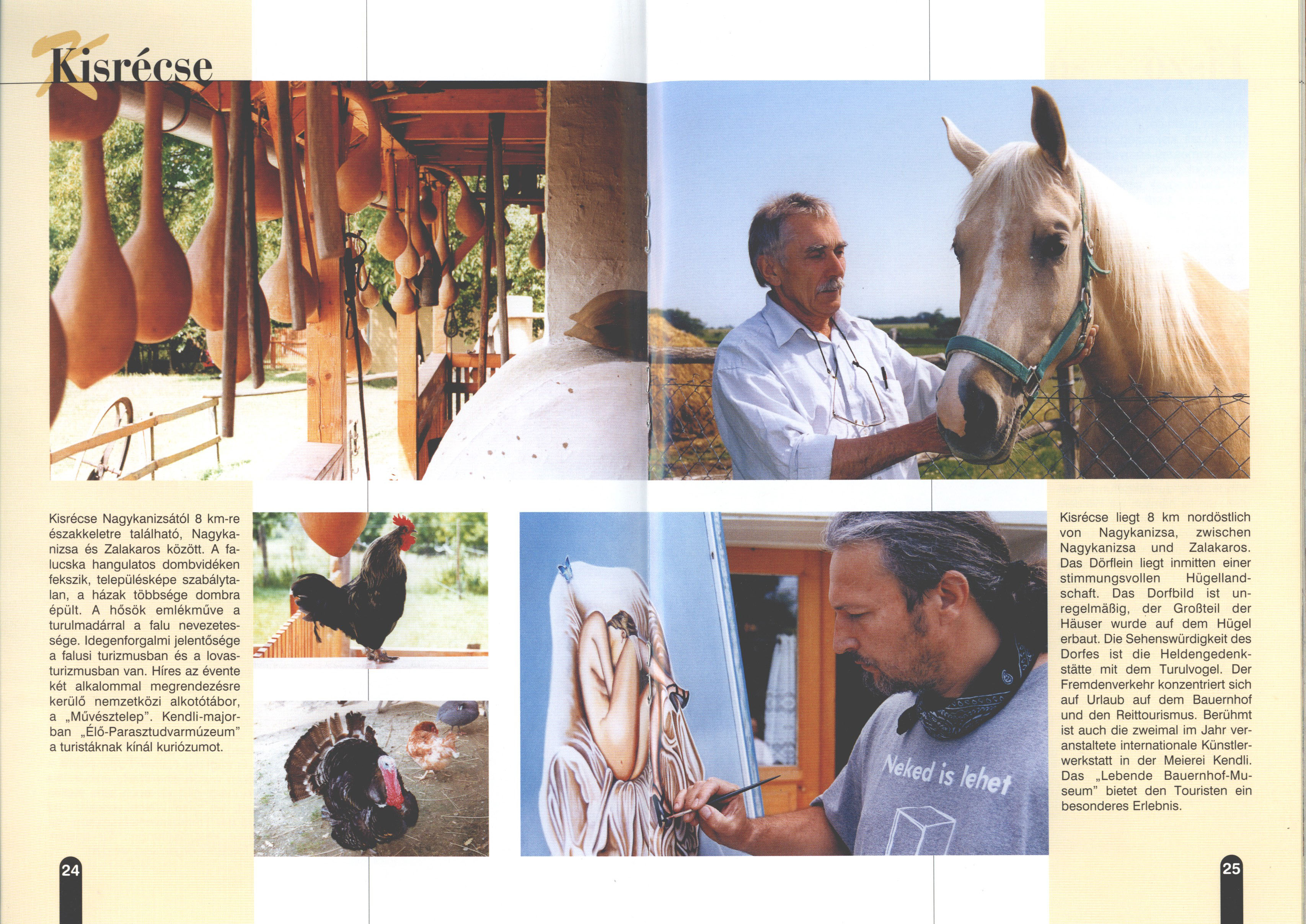 Nyilvános 2239 | 7787 | Kisrécse | Kisrécse Nagykanizsától 8 km-re északkeletre található, Nagykanizsa és Zalakaros között. A falucska hangulatos dombvidéken fekszik, településképe szabálytalan, a házak többsége dombra épült. A hősök emlékműve a turulmadárral a falu nevezetessége. Idegenforgalmi jelentősége a falusi turizmusban és a lovasturizmusban van. Híres az évente két alkalommal megrendezésre kerülő nemzetközi alkotótábor, a „Művésztelep". Kendli-majorban „Élő-Parasztudvarmúzeum" a turistáknak kínál kuriózumot. Kisrécse liegt 8 km nordöstlich von Nagykanizsa, zwischen Nagykanizsa und Zalakaros. Das Dörflein liegt inmitten einer stimmungsvollen Hügellandschaft. Das Dorfbild ist unregelmäßig, der Großteil der Häuser wurde auf dem Hügel erbaut. Die Sehenswürdigkeit des Dorfes ist die Heldengedenkstätte mit dem Turulvogel. Der Fremdenverkehr konzentriert sich auf Urlaub auf dem Bauernhof und den Reittourismus. Berühmt ist auch die zweimal im Jahr veranstaltete internationale Künstlerwerkstatt in der Meierei Kendli. Das „Lebende Bauernhof-Museum" bietet den Touristen ein besonderes Erlebnis. Dieses Text stammt von: Titel: Hívogató a Régiók Kapujában - Útikönyv Látnivalók Nagykanizsán és Térségében (Einladend in dem Tor des Gebiets - Reisebuch - Sehenswürdigkeiten in Nagykanizsa und Umgebung) Herausgegeben von: Nagykanizsa és a Környező Települések Területfejlesztési Társulása (Verein für Gebietsentwicklung in Nagykanizsa und in ihrer Umgebung) 8800 Nagykanizsa, Petőfi Sándor út 5. Tel.: 06 93/536-453 • 06 93/536-454 Tel ./Fax: 06 93/326-323 E-mail: terstars@axelero.hu www.kanizsaterseg.celodin.hu |