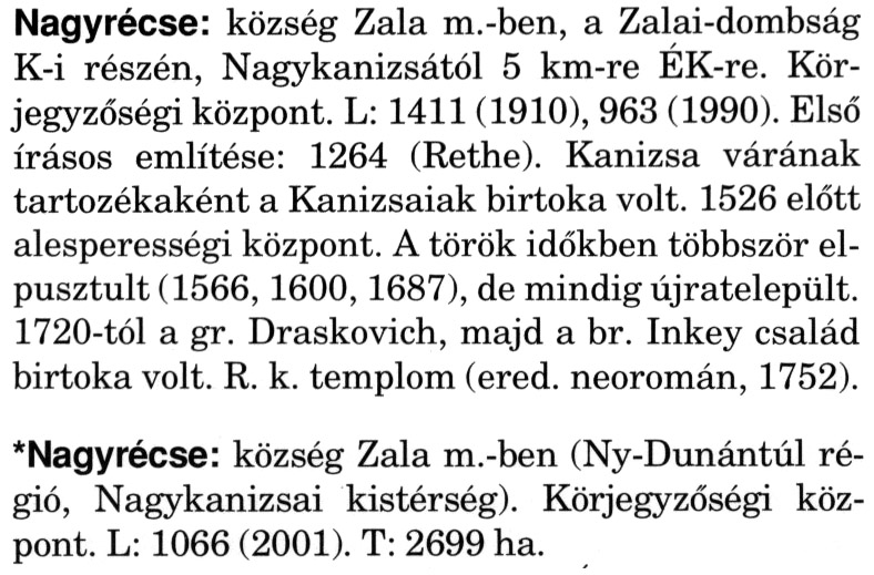 Nyilvános 2319 | 6132 | A szócikkek felismertetett szövege: | (A csillag után a kiegészítő kötetből származó szöveg következik) Nagyrécse: község Zala m.-ben, a Zalai-dombság K-i részén, Nagykanizsától 5 km-re ÉK-re. Körjegyzőségi központ. L: 1411 (1910), 963 (1990). Első írásos említése: 1264 (Rethe). Kanizsa várának tartozékaként a Kanizsaiak birtoka volt. 1526 előtt alesperességi központ. A török időkben többször elpusztult (1566, 1600, 1687), de mindig újratelepült. 1720-tól a gr. Draskovich, majd a br. Inkey család birtoka volt. R. k. templom (ered. neoromán, 1752). *Nagyrécse: község Zala m.-ben (Ny-Dunántúl régió, Nagykanizsai kistérség). Körjegyzőségi központ. L: 1066 (2001). T: 2699 ha. A szócikkek a következő lexikonból származnak: Cím: Magyar nagylexikon Közreműködő: Élesztős László (1949) (szerk.) ; Barabás Éva (1943) (szerk.) ; Berényi Gábor (1946) (szerk.) ; Bárány Lászlóné (szerk.) ; Adelmann-né Kertész Judit (1945) (közrem.) ; Froemel Károlyné Jáky Éva (1936) (közrem.) ; Akadémiai Kiadó és Nyomda Vállala Szerz. közl.: [... Élesztős László főszerk.] ; [szerk. Barabás Éva et al.] ; [bibliogr. Adelmanné Kertész Judit] ; [kész. az Akadémiai Kiadó Magyar Nagylexikon Szerkesztőségében] Kiadás: Budapest : Akad. K., 1993- Kötetei: 1. köt., A - Anc 2. köt., And - Bag 3. köt., Bah - Bij 4. köt., Bik - Bz 5. köt., C - Csem 6. köt., Csen - Ec 7. köt., Ed - Fe 8. köt., Ff - Gyep 9. köt., Gyer - Iq 10. köt., Ir - Kip 11. köt., Kir - Lem 12. köt., Len - Mep 13. köt., Mer - Nyk 14. köt., Nyl - Pom 15. köt., Pon - Sek 16. köt., Sel - Szö 17. köt., Szp - Ung 18. köt., Unh - Z 19. köt., Kiegészítő kötet, A - Z ETO jelzet: 030=945.11 Szakjelzet: 030 Cutter: M 14 ISBN: 963-05-6611-7 [!ISBN 963-05-6615-X] Nyelv: magyar Megjegyzés: Az 5. kötettől kiad. a Magyar Nagylexikon Kiadó ; A 6. kötettől főszerk. Berényi Gábor ; A 6. kötettől szakszerk. Bárány Lászlóné et al. ; A 6. kötettől bibliogr. Froemel Károlyné ; Bibliogr. a szócikkek végén |