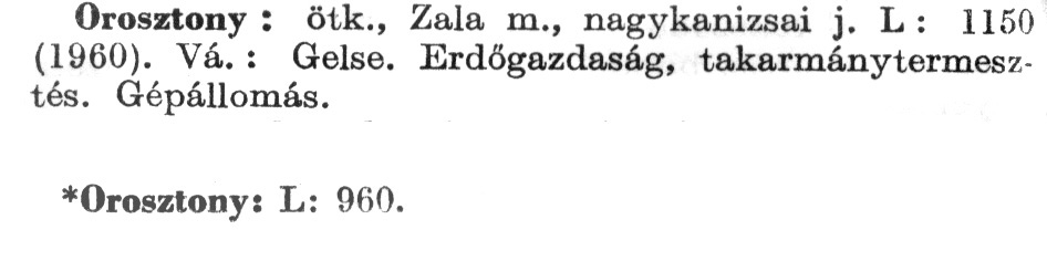 Nyilvános 2332 | 6104 | Rövid leírás | Teljes leírás (1003 B) | A szócikkek felismertetett szövege: (A csillag után az 1972-es kiadású kiegészítő kötetből származó szöveg következik) Orosztony: ötk., Zala m., nagykanizsai j. L: 1150 (1960). Vá.: Gelse. Erdőgazdaság, takarmánytermesztés. Gépállomás. *Orosztony: L: 960. A szócikkek a következő lexikonból származnak: Cím: Új magyar lexikon Közreműködő: Berei Andor (1900-1979) (szerk.) Szerz. közl.: [szerk. Berei Andor et al.] Kiadás jelzés: 2. lny. Kiadás: Budapest : Akad. K., 1961-1962 Kötetei: 1., A - C 2., D - F 3., G - J 4., K - Me 5., Mf - R 6., S - Z 7. köt., A-Z Kiegészítő kötet (1972) Kiegészítő kötet, 1962÷1980 (1981) ETO jelzet: 03=945.11 Szakjelzet: 030 Cutter: U 28 Nyelv: magyar Megjegyzés: Bibliogr. a címszavak egy részének végén |