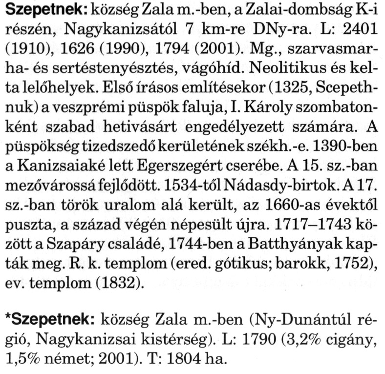 Nyilvános 2082 | 5627 | A szócikkek felismertetett szövege: | (A csillag után a kiegészítő kötetből származó szöveg következik) Szepetnek: község Zala m.-ben, a Zalai-dombság K-i részén, Nagykanizsától 7 km-re DNy-ra. L: 2401 (1910), 1626 (1990), 1794 (2001). Mg., szarvasmarha- és sertéstenyésztés, vágóhíd. Neolitikus és kelta lelőhelyek. Első írásos említésekor (1325, Scepeth-nuk) a veszprémi püspök faluja, I. Károly szombatonként szabad hetivásárt engedélyezett számára. A püspökség tizedszedő kerületének székh.-e. 1390-ben a Kanizsaiaké lett Egerszegért cserébe. A 15. sz.-ban mezővárossá fejlődött. 1534-től Nádasdy-birtok. A 17. sz.-ban török uralom alá került, az 1660-as évektől puszta, a század végén népesült újra. 1717—1743 között a Szapáry családé, 1744-ben a Batthyányak kapták meg. R. k. templom (ered. gótikus; barokk, 1752), ev. templom (1832). *Szepetnek: község Zala m.-ben (Ny-Dunántúl régió, Nagykanizsai kistérség). L: 1790 (3,2% cigány, 1,5% német; 2001). T: 1804 ha. A szócikkek a következő lexikonból származnak: Cím: Magyar nagylexikon Közreműködő: Élesztős László (1949) (szerk.) ; Barabás Éva (1943) (szerk.) ; Berényi Gábor (1946) (szerk.) ; Bárány Lászlóné (szerk.) ; Adelmann-né Kertész Judit (1945) (közrem.) ; Froemel Károlyné Jáky Éva (1936) (közrem.) ; Akadémiai Kiadó és Nyomda Vállala Szerz. közl.: [... Élesztős László főszerk.] ; [szerk. Barabás Éva et al.] ; [bibliogr. Adelmanné Kertész Judit] ; [kész. az Akadémiai Kiadó Magyar Nagylexikon Szerkesztőségében] Kiadás: Budapest : Akad. K., 1993- Kötetei: 1. köt., A - Anc 2. köt., And - Bag 3. köt., Bah - Bij 4. köt., Bik - Bz 5. köt., C - Csem 6. köt., Csen - Ec 7. köt., Ed - Fe 8. köt., Ff - Gyep 9. köt., Gyer - Iq 10. köt., Ir - Kip 11. köt., Kir - Lem 12. köt., Len - Mep 13. köt., Mer - Nyk 14. köt., Nyl - Pom 15. köt., Pon - Sek 16. köt., Sel - Szö 17. köt., Szp - Ung 18. köt., Unh - Z 19. köt., Kiegészítő kötet, A - Z ETO jelzet: 030=945.11 Szakjelzet: 030 Cutter: M 14 ISBN: 963-05-6611-7 [!ISBN 963-05-6615-X] Nyelv: magyar Megjegyzés: Az 5. kötettől kiad. a Magyar Nagylexikon Kiadó ; A 6. kötettől főszerk. Berényi Gábor ; A 6. kötettől szakszerk. Bárány Lászlóné et al. ; A 6. kötettől bibliogr. Froemel Károlyné ; Bibliogr. a szócikkek végén |