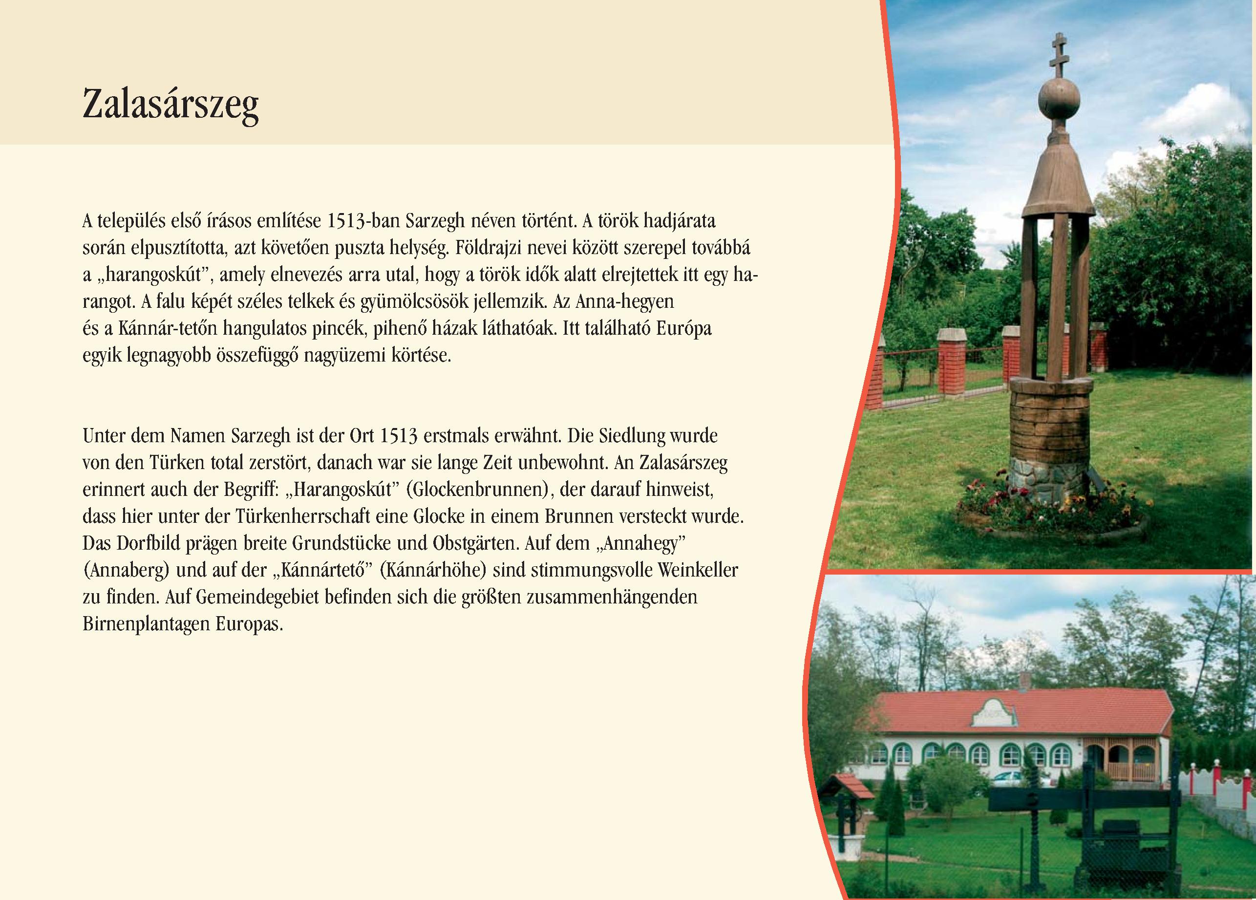 Nyilvános 2215 | 6112 | Zalasárszeg | Unter dem Namen Sarzegh ist der Ort 1513 erstmals erwähnt. Die Siedlung wurde von den Türken total zerstört, danach war sie lange Zeit unbewohnt. An Zalasárszeg erinnert auch der Begriff: ,,Harangoskút" (Glockenbrunnen), der darauf hinweist, dass hier unter der Türkenherrschaft eine Glocke in einem Brunnen versteckt wurde. Das Dorfbild prägen breite Grundstücke und Obstgärten. Auf dem ,,Annahegy" (Annaberg) und auf der ,,Kánnártető" (Kánnárhöhe) sind stimmungsvolle Weinkeller zu finden. Auf Gemeindegebiet befinden sich die größten zusammenhängenden Birnenplantagen Europas. Dieses Text stammt von: Pannonhát tájpark prospektus 2006. Web: http://www.pannonhat.hu/ (auch in Deutsch) |