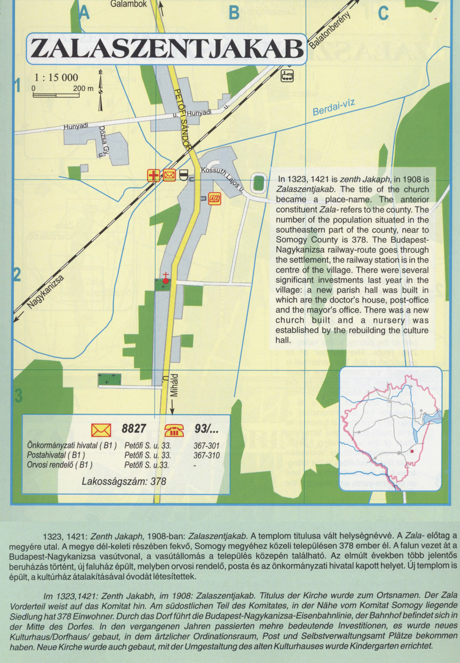 Nyilvános 1958 | 6679 | ZALASZENTJAKAB | 1323, 1421: Zenth Jakaph, 1908-ban: Zalaszentjakab. A templom titulusa vált helységnévvé. A Zala- előtag a megyére utal. A megye dél-keleti részében fekvő, Somogy megyéhez közeli településen 378 ember él. A falun vezet át a Budapest-Nagykanizsa vasútvonal, a vasútállomás a település közepén található. Az elmúlt években több jelentős beruházás történt, új faluház épült, melyben orvosi rendelő, posta és az önkormányzati hivatal kapott helyet. Új templom is épült, a kultúrház átalakításával óvodát létesítettek. lm 1323,1421: Zenth Jakabh, im 1908: Zalaszentjakab. Titulus der Kirche wurde zum Ortsnamen. Der Zala Vorderteil weist auf das Komitat hin. Am südostlichen Teil des Komitates, in der Nähe vom Komitat Somogy liegende Siedlung hat 378 Einwohner. Durch das Dorf führt die Budapest-Nagykanizsa-Eisenbahnlinie, der Bahnhof befindet sich in der Mitte des Dorfes. In den vergangenen Jahren passierten mehre bedeutende Investitionen, es wurde neues Kulturhaus/Dorfhaus/ gebaut, in dem ärtzlicher Ordinationsraum, Post und Selbstverwaltungsamt Plätze bekommen haben. Neue Kirche wurde auch gebaut, mit der Umgestaltung des alten Kulturhauses wurde Kindergarten errichtet. In 1323,1421 is zenth Jakaph, in 1908 is Zalaszentjakab. The title of the church became a place-name. The anterior constituent Zala- refers to the county. The number of the population situated in the southeastern part of the county, near to Somogy County is 378. The Budapest-Nagykanizsa railway-route goes through the settlement, the railway station is in the centre of the village. There were several significant investments last year in the village: a new parish hall was built in which are the doctor\'s house, post-office and the mayor\'s office. There was a new church built and a nursery was established by the rebuilding the culture hall. A részlet a következő kiadványból származik/Die Teile stammen vom volgenden Buch/This text came from the following book: Cím/Titel/Title: Zala megye településeinek atlasza - 257 település részletes térképe/Atlas der Komitat Zala - 257 Detailte Siedlungskarten/Zala county\'s Atlas - 257 settlement maps. Közreműködő/contributor: Lackner László (1943) (fotó) Kiadás/Ausgabe/Publisher: Gyula : HISZI-MAP, 1997 Sorozat/Serie/Series: Indulástól - megérkezésig... ETO: 912(439.121-2) ; 908.439.121 Cutter: Z 19 ISBN: 963-610-025-4 Oldalszám/Seiten/Pages: 323, 81 p. Megjegyzés/Note: Lezárva/Abgeschlossen am/Closed am: 1997. máj. 30. |