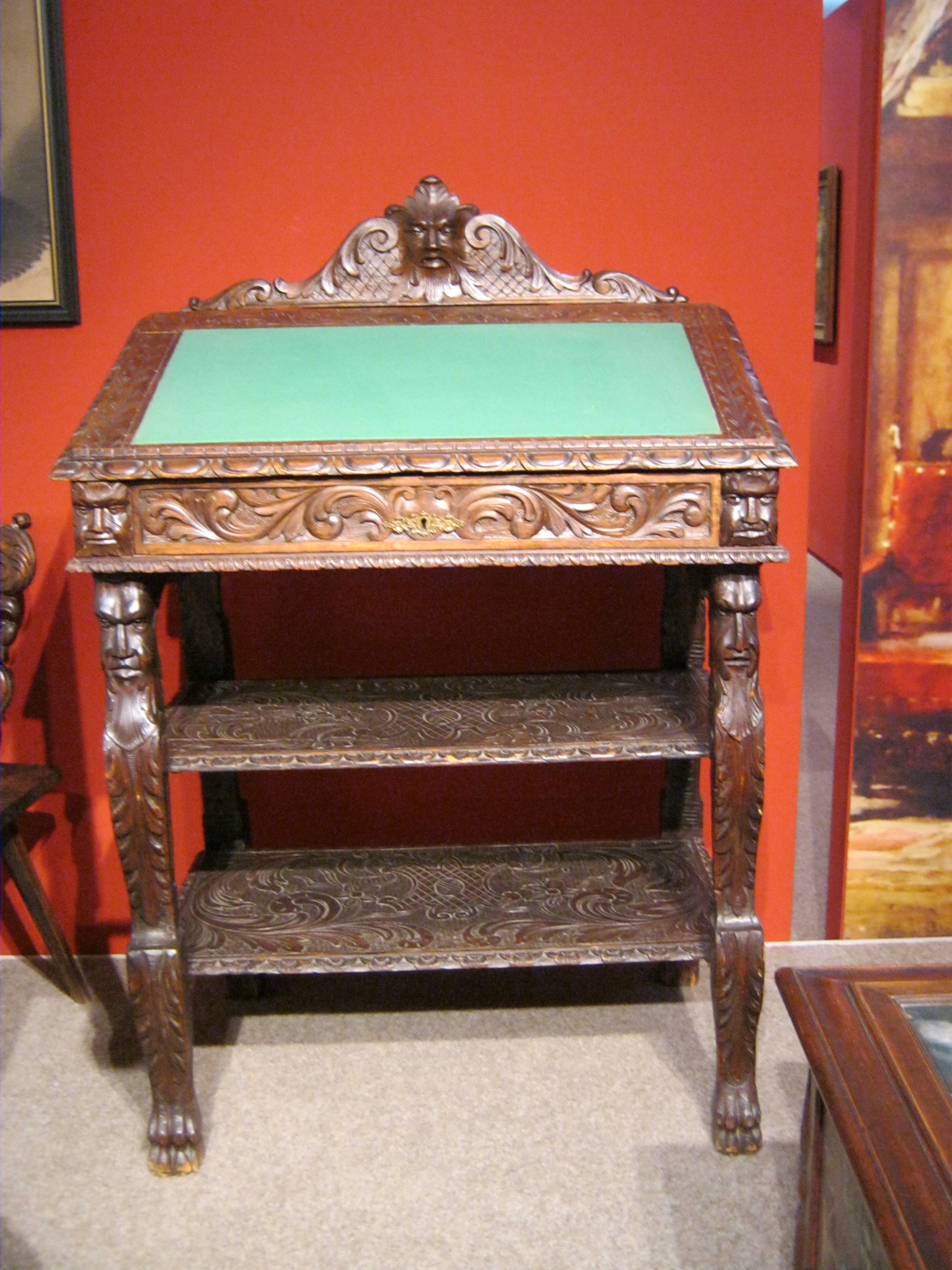Nyilvános 1007 | 1482 | Nyíregyháza, Benczúr tér 21. Jósa András Múzeum | Magyarország egyik legrégibb múzeumát Dr. Jósa András alapította 1868-ban, akinek ma nevét viseli. A képen Benczúr Gyula emlékszobájának részlete. A nagy magyar festőművész 1844-ben Nyíregyházán született (lásd: Nyíregyháza, Kossuth tér 8.), apja gyógyszerész volt. A Benczúr-emlékszobában alkotásai mellett eredeti bútorok, s a festőművész több használati tárgya is megtekinthető, mint például a képen látható írópult. Felh. irod.: Látnivalók Szabolcs-Szatmár-Bereg megyében. Miskolc, Well-PRess, 1999 http://jam.nyirbone.hu A fénykép 2010 augusztus elején készült. |