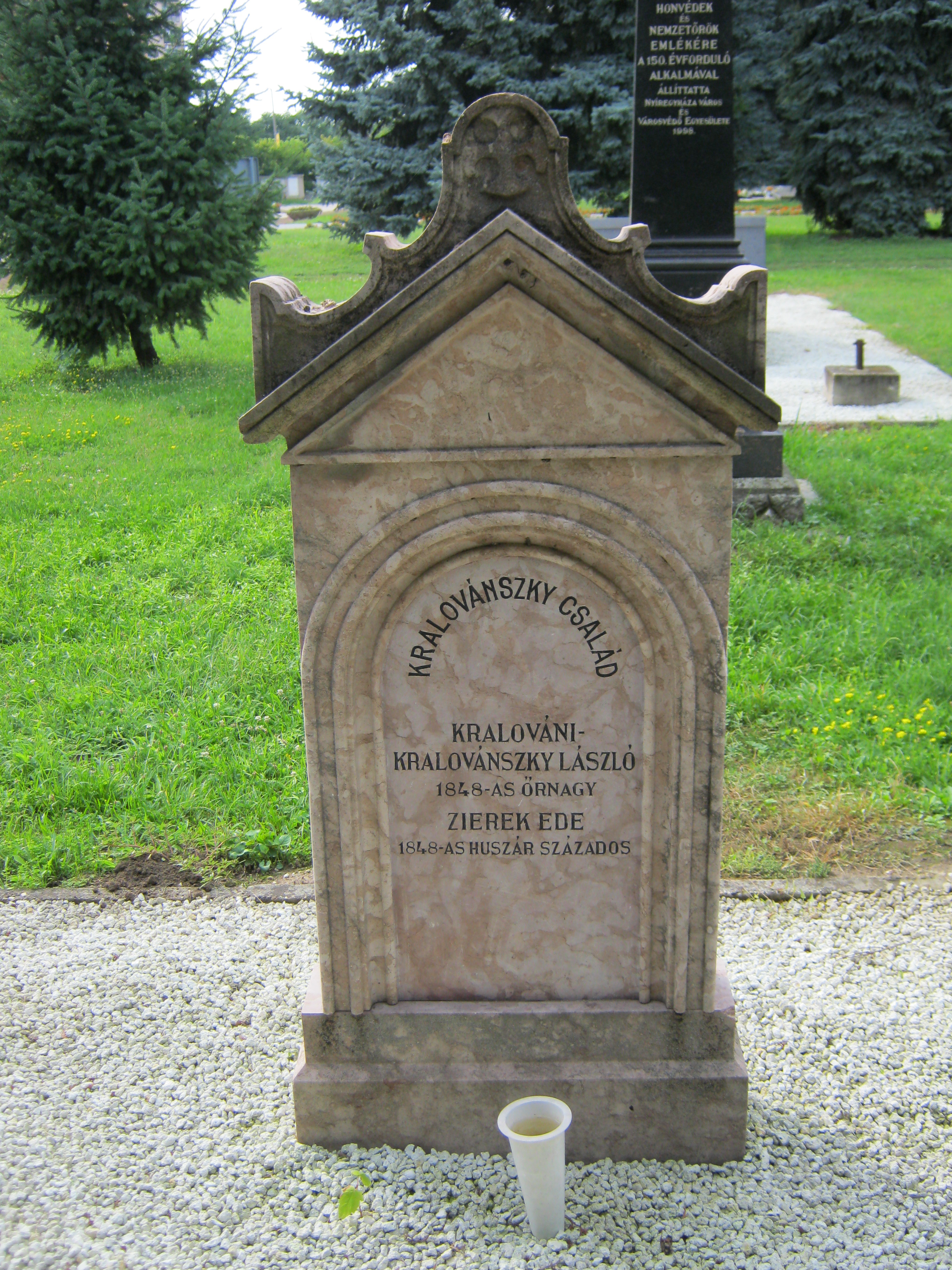 Nyilvános 1019 | 2259 | Nyíregyháza, Pazonyi tér, Északi temető: Kralovánszky László | A Dózsa György út vezet Nyíregyháza Északi temetőjébe. A díszsírhelyek sorában található a Kralovánszky család legfiatalabb fiának, Lászlónak sírköve. A Kralovánszky család kiemelkedő tevékenysége az 1848-as szabadságharchoz kötődik. Országosan is egyedülálló, hogy egy családnak hét tagja aktív részese volt a történelmi időknek és valamennyien tiszti rangot kaptak. Az apa őrnagy, hat gyermeke - köztük László - százados volt. (A családi sírbolt is ebben a temetőben van, sajnos, nem sikerült ráakadnom - K.K.) Felh. irod.: Fazekas Árpád - Szekrényes András: Nyíregyháza temetői. Nyíregyháza, 1990 A fénykép 2010 augusztus elején készült |