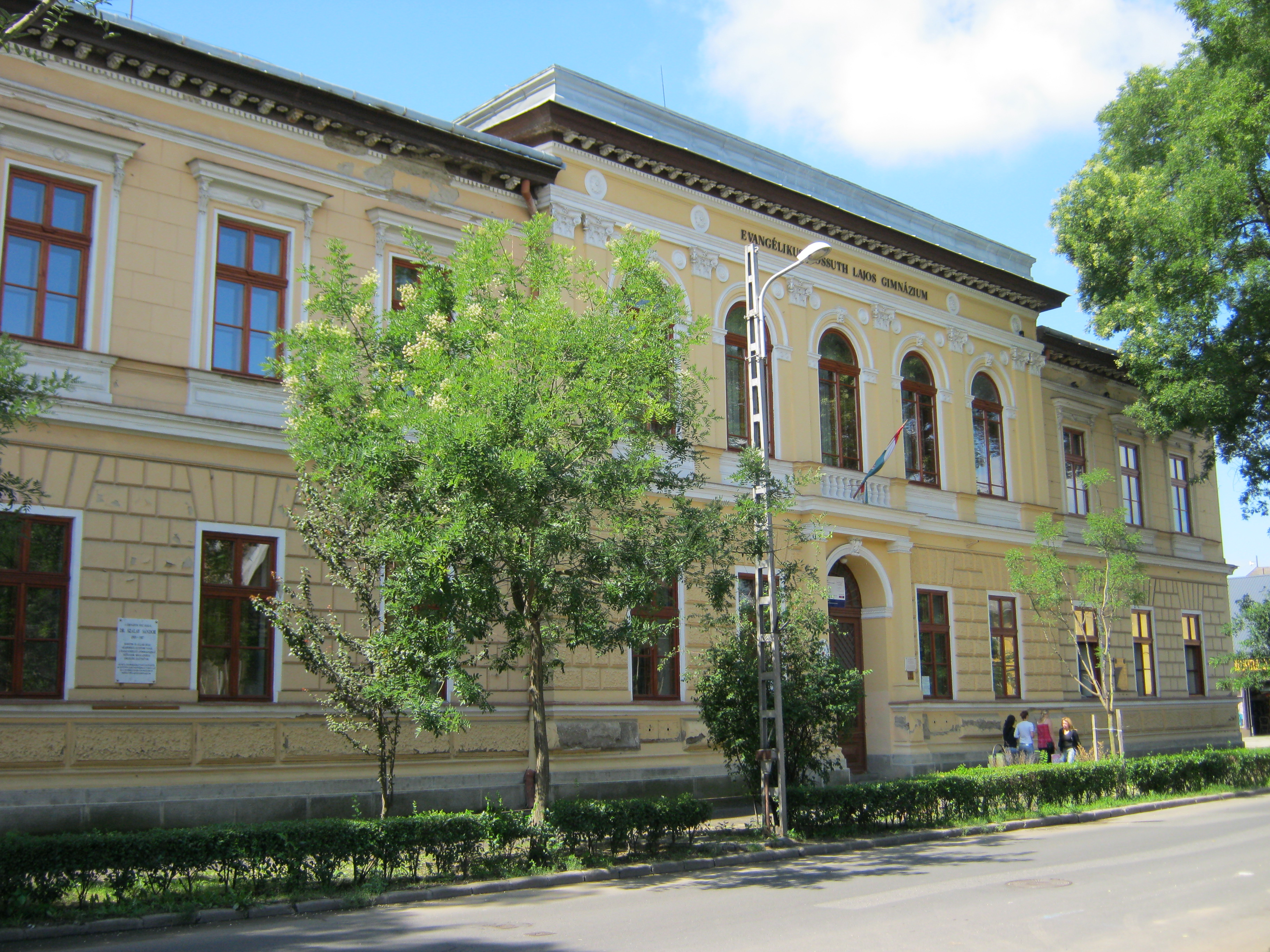Nyilvános 979 | 1374 | Nyíregyháza, Szent István utca 19. Evangélikus Kossuth Lajos Gimnázium | A megye legrégibb középiskolája. 1808-ban alapították mint evangélikus professzori iskolát (lásd: Nyíregyháza, Luther utca 5.). Nyolc osztályos gimnáziummá 1888-ra fejlesztették fel. Mai épületét ekkoriban, 1887-ben emelték Bobula János tervei szerint. Kossuth Lajos nevét 1921-ben vette fel. Az 1948-ban államosított iskolát 1992-ben kapta vissza az evangélikus egyház. Homlokzatán számos márványtábla emlékezik kiváló diákjaira, tanáraira. Felh. irod.: www.eklg.hu A fénykép 2010 augusztus elején készült |