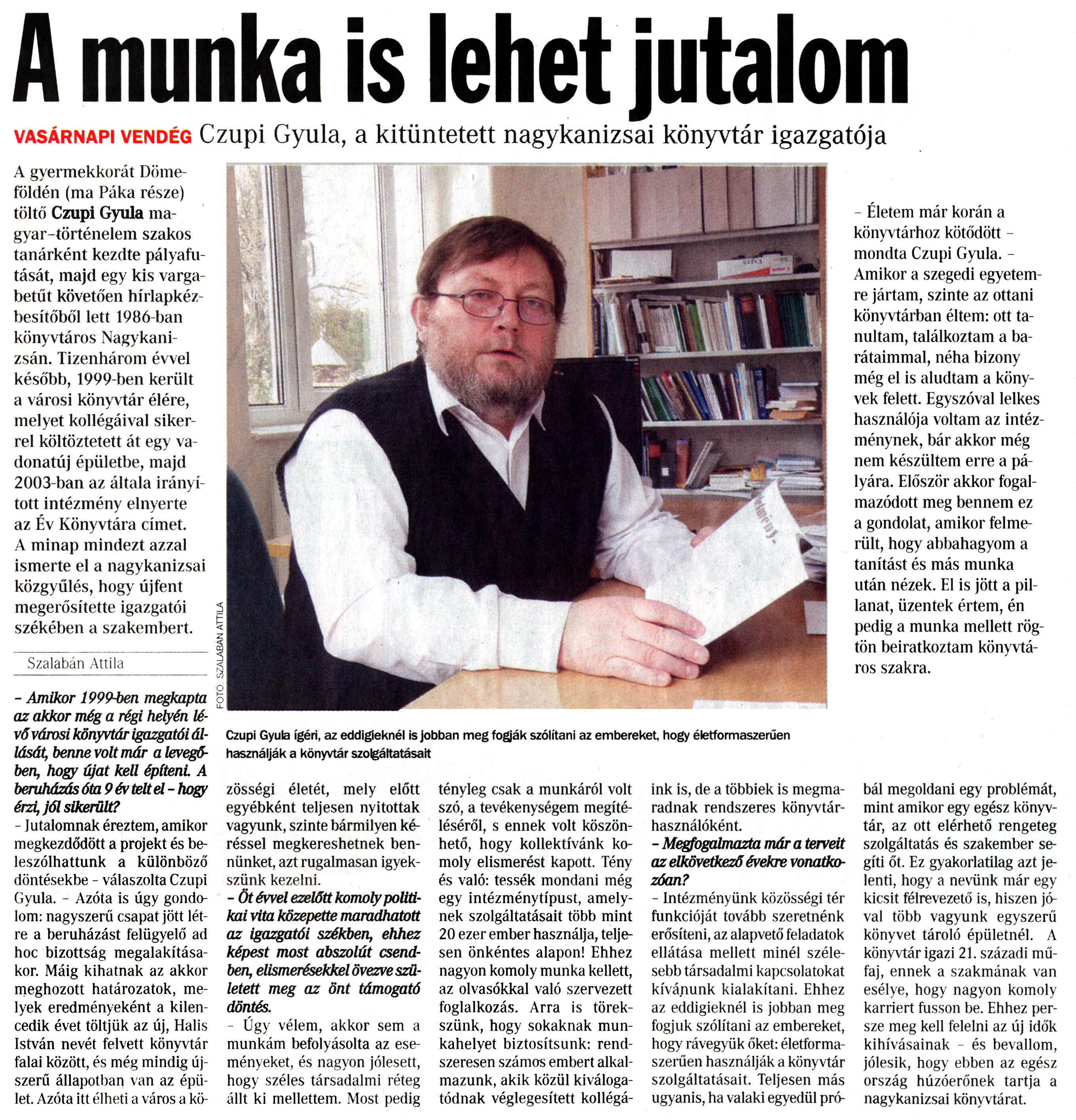 Nyilvános 1186 | 2625 | Vasárnapi Zalai Hírlap 2009. április 5. 13. szám 3. oldal - A munka is lehet jutalom | A cikk szövege: A munka is lehet jutalom vasárnapi vendég Czupi Gyula, a kitüntetett nagykanizsai könyvtár igazgatója - Életem már korán a könyvtárhoz kötődött -mondta Czupi Gyula. -Amikor a szegedi egyetemre jártam, szinte az ottani könyvtárban éltem: ott tanultam, találkoztam a barátaimmal, néha bizony még el is aludtam a könyvek felett. Egyszóval lelkes használója voltam az intézménynek, bár akkor még nem készültem erre a pályára. Először akkor fogalmazódott meg bennem ez a gondolat, amikor felmerült, hogy abbahagyom a tanítást és más munka után nézek. El is jött a pillanat, üzentek értem, én pedig a munka mellett rögtön beiratkoztam könyvtáros szakra. Czupi Gyula ígéri, az eddigieknél is jobban meg fogják szólítani az embereket hogy életformaszerűen használják a könyvtár szolgáltatásait A gyermekkorát Dömeföldén (ma Páka része) töltő Czupi Gyula magyar-történelem szakos tanárként kezdte pályafutását, majd egy kis vargabetűt követően hírlapkézbesítőből lett 1986-ban könyvtáros Nagykanizsán. Tizenhárom évvel később, 1999-ben került a városi könyvtár élére, melyet kollégáival sikerrel költöztetett át egy vadonatúj épületbe, majd 2003-ban az általa irányított intézmény elnyerte az Év Könyvtára címet. A minap mindezt azzal ismerte el a nagykanizsai közgyűlés, hogy újfent megerősítette igazgatói székében a szakembert. Szalabán Attila - Amikor 1999-ben megkapta az akkor még a régi helyén lévő városi könyvtár igazgatói állását, benne volt már a levegőben, hogy újat kell építeni. A beruházás óta 9 év telt el - hogy érzi, jól sikerült? - Jutalomnak éreztem, amikor megkezdődött a projekt és beleszólhattunk a különböző döntésekbe - válaszolta Czupi Gyula. - Azóta is úgy gondolom: nagyszerű csapat jött létre a beruházást felügyelő ad hoc bizottság megalakításakor. Máig kihatnak az akkor meghozott határozatok, melyek eredményeként a kilencedik évet töltjük az új, Halis István nevét felvett könyvtár falai között, és még mindig újszerű állapotban van az épület. Azóta itt élheti a város a közösségi életét, mely előtt egyébként teljesen nyitottak vagyunk, szinte bármilyen kéréssel megkereshetnek bennünket, azt rugalmasan igyekszünk kezelni. - Öt évvel ezelőtt komoly politikai vita közepette maradhatott az igazgatói székben, ehhez képest most abszolút csendben, elismerésekkel övezve született meg az önt támogató döntés. - Úgy vélem, akkor sem a munkám befolyásolta az eseményeket, és nagyon jólesett, hogy széles társadalmi réteg állt ki mellettem. Most pedig tényleg csak a munkáról volt szó, a tevékenységem megítéléséről, s ennek volt köszönhető, hogy kollektívánk komoly elismerést kapott. Tény és való: tessék mondani még egy intézménytípust, amelynek szolgáltatásait több mint 20 ezer ember használja, teljesen önkéntes alapon! Ehhez nagyon komoly munka kellett, az olvasókkal való szervezett foglalkozás. Arra is törekszünk, hogy sokaknak munkahelyet biztosítsunk: rendszeresen számos embert alkalmazunk, akik közül kiváloga-tódnak véglegesített kollégáink is, de a többiek is megmaradnak rendszeres könyvtárhasználóként. - Megfogalmazta már a terveit az elkövetkező évekre vonatkozóan? - Intézményünk közösségi tér funkcióját tovább szeretnénk erősíteni, az alapvető feladatok ellátása mellett minél szélesebb társadalmi kapcsolatokat kívánunk kialakítani. Ehhez az eddigieknél is jobban meg fogjuk szólítani az embereket, hogy rávegyük őket: életformaszerűen használják a könyvtár szolgáltatásait. Teljesen más ugyanis, ha valaki egyedül próbál megoldani egy problémát, mint amikor egy egész könyvtár, az ott elérhető rengeteg szolgáltatás és szakember segíti őt. Ez gyakorlatilag azt jelenti, hogy a nevünk már egy kicsit félrevezető is, hiszen jóval több vagyunk egyszerű könyvet tároló épületnél. A könyvtár igazi 21. századi műfaj, ennek a szakmának van esélye, hogy nagyon komoly karriert fusson be. Ehhez persze meg kell felelni az új idők kihívásainak - és bevallom, jólesik, hogy ebben az egész ország húzóerőnek tartja a nagykanizsai könyvtárat. |