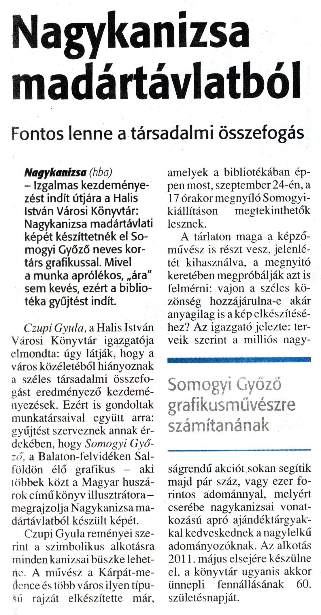 Nyilvános 1160 | 1439 | Zalai Hírlap 2009. szeptember 15. 216. szám 7. oldal - Nagykanizsa madártávlatból | A cikk szövege: Nagykanizsa madártávlatból Fontos lenne a társadalmi összefogás Somogyi Győző grafikusművészre számítanának Nagykanizsa (hba) - Izgalmas kezdeményezést indít útjára a Halis István Városi Könyvtár: Nagykanizsa madártávlati képét készíttetnék el Somogyi Győző neves kortárs grafikussal. Mivel a munka aprólékos, „ára" sem kevés, ezért a bibliotéka gyűjtést indít. Czupi Gyula, a Halis István Városi Könyvtár igazgatója elmondta: úgy látják, hogy a város közéletéből hiányoznak a széles társadalmi összefogást eredményező kezdeményezések. Ezért is gondoltak munkatársaival együtt arra: gyűjtést szerveznek annak érdekében, hogy Somogyi Győző, a Balaton-felvidéken Salföldön élő grafikus - aki többek közt a Magyar huszárok című könyv illusztrátora - megrajzolja Nagykanizsa madártávlatból készült képét. Czupi Gyula reményei szerint a szimbolikus alkotásra minden kanizsai büszke lehetne. A művész a Kárpát-medence és több város ilyen típusú rajzát elkészítette már, amelyek a bibliotékában éppen most, szeptember 24-én, a 17 órakor megnyíló Somogyikiállításon megtekinthetők lesznek. A tárlaton maga a képzőművész is részt vesz, jelenlétét kihasználva, a megnyitó keretében megpróbálják azt is felmérni: vajon a széles közönség hozzájárulna-e akár anyagilag is a kép elkészítéséhez? Az igazgató jelezte: terveik szerint a milliós nagyságrendű akciót sokan segítik majd pár száz, vagy ezer forintos adománnyal, melyért cserébe nagykanizsai vonatkozású apró ajándéktárgyakkal kedveskednek a nagylelkű adományozóknak. Az alkotás 2011. május elsejére készülne el, a könyvtár ugyanis akkor ünnepli fennállásának 60. születésnapját. |