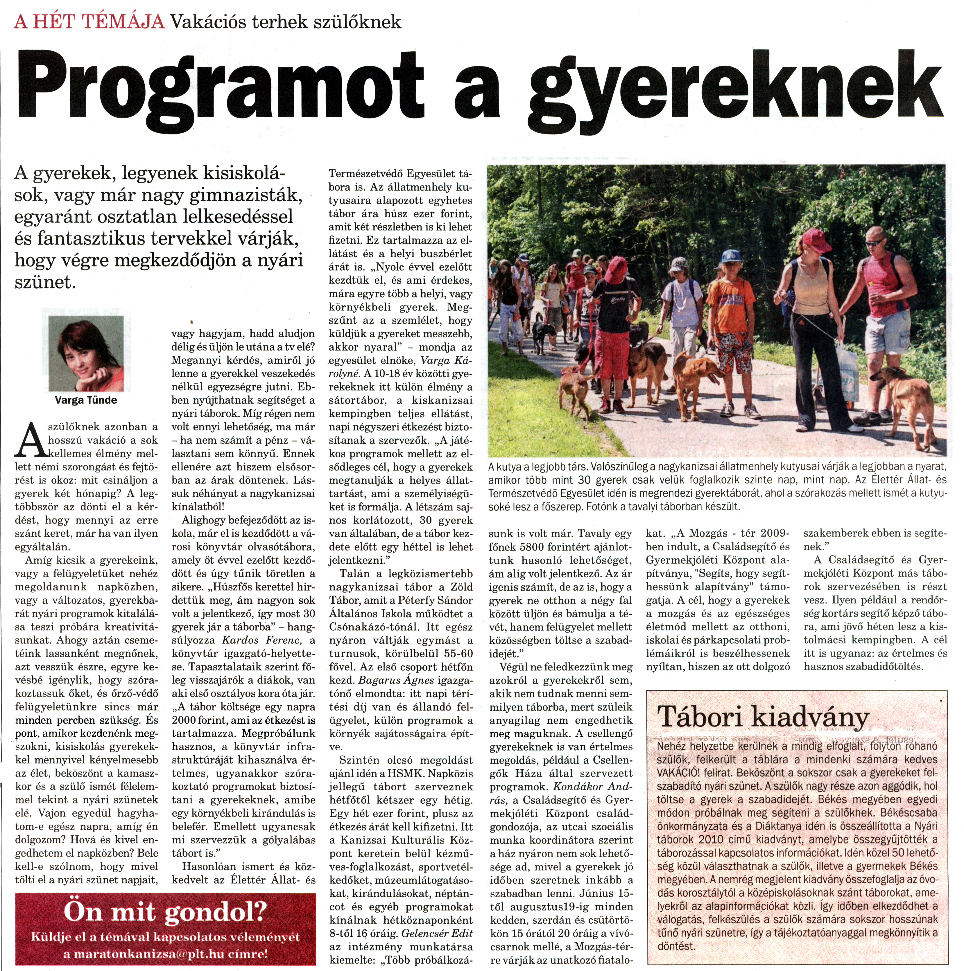 Nyilvános 1168 | 1839 | Nagykanizsai Maraton 2010. június 18. 24. szám 3. oldal - Programot a gyereknek. Benne: a könyvtár nyári tábora | A cikk szövege: A HÉT TÉMÁJA Vakációs terhek szülőknek Programot a gyereknek A gyerekek, legyenek kisiskolások, vagy már nagy gimnazisták, egyaránt osztatlan lelkesedéssel és fantasztikus tervekkel várják, hogy végre megkezdődjön a nyári szünet. A kutya a legjobb társ. Valószínűleg a nagykanizsai állatmenhely kutyusai várják a legjobban a nyarat, amikor több mint 30 gyerek csak velük foglalkozik szinte nap, mint nap. Az Élettér Állat- és Természetvédő Egyesület Idén is megrendezi gyerektáborát, ahol a szórakozás mellett ismét a kutyusoké lesz a főszerep. Fotónk a tavalyi táborban készült. Varga Tünde A szülőknek azonban a hosszú vakáció a sok kellemes élmény mellett némi szorongást és fejtörést is okoz: mit csináljon a gyerek két hónapig? A legtöbbször az dönti el a kérdést, hogy mennyi az erre szánt keret, már ha van ilyen egyáltalán. Amíg kicsik a gyerekeink, vagy a felügyeletüket nehéz megoldanunk napközben, vagy a változatos, gyerekbarát nyári programok kitalálása teszi próbára kreativitásunkat. Ahogy aztán csemetéink lassanként megnőnek, azt vesszük észre, egyre kevésbé igénylik, hogy szórakoztassuk őket, és őrző-védő felügyeletünkre sincs már minden percben szükség. És pont, amikor kezdenénk megszokni, kisiskolás gyerekekkel mennyivel kényelmesebb az élet, beköszönt a kamaszkor és a szülő ismét félelemmel tekint a nyári szünetek elé. Vajon egyedül hagyhatom-e egész napra, amíg én dolgozom? Hová és kivel engedhetem el napközben? Bele kell-e szólnom, hogy mivel tölti el a nyári szünet napjait, vagy hagyjam, hadd aludjon délig és üljön le utána a tv elé? Megannyi kérdés, amiről jó lenne a gyerekkel veszekedés nélkül egyezségre jutni. Ebben nyújthatnak segítséget a nyári táborok. Míg régen nem volt ennyi lehetőség, ma már - ha nem számít a pénz - választani sem könnyű. Ennek ellenére azt hiszem elsősorban az árak döntenek. Lássuk néhányat a nagykanizsai kínálatból! Alighogy befejeződött az iskola, már el is kezdődött a városi könyvtár olvasótábora, amely öt évvel ezelőtt kezdődött és úgy tűnik töretlen a sikere. „Húszfős kerettel hirdettük meg, ám nagyon sok volt a jelentkező, így most 30 gyerek jár a táborba" - hangsúlyozza Kardos Ferenc, a könyvtár igazgató-helyettese. Tapasztalataik szerint főleg visszajárok a diákok, van aki első osztályos kora óta jár. „A tábor költsége egy napra 2000 forint, ami az étkezést is tartalmazza. Megpróbálunk hasznos, a könyvtár infrastruktúráját kihasználva értelmes, ugyanakkor szórakoztató programokat biztosítani a gyerekeknek, amibe egy környékbeli kirándulás is belefér. Emellett ugyancsak mi szervezzük a gólyalábas tábort is." Hasonlóan ismert és közkedvelt az Élettér Állat- és Természetvédő Egyesület tábora is. Az állatmenhely kutyusaira alapozott egyhetes tábor ára húsz ezer forint, amit két részletben is ki lehet fizetni. Ez tartalmazza az ellátást és a helyi buszbérlet árát is. „Nyolc évvel ezelőtt kezdtük el, és ami érdekes, mára egyre több a helyi, vagy környékbeli gyerek. Megszűnt az a szemlélet, hogy küldjük a gyereket messzebb, akkor nyaral" - mondja az egyesület elnöke, Varga Károlyné. A 10-18 év közötti gyerekeknek itt külön élmény a sátortábor, a kiskanizsai kempingben teljes ellátást, napi négyszeri étkezést biztosítanak a szervezők. „A játékos programok mellett az elsődleges cél, hogy a gyerekek megtanulják a helyes állattartást, ami a személyiségüket is formálja. A létszám sajnos korlátozott, 30 gyerek van általában, de a tábor kezdete előtt egy héttel is lehet jelentkezni." Talán a legközismertebb nagykanizsai tábor a Zöld Tábor, amit a Péterfy Sándor Általános Iskola működtet a Csónakázó-tónál. Itt egész nyáron váltják egymást a turnusok, körülbelül 55-60 fővel. Az első csoport hétfőn kezd. Bagarus Ágnes igazgatónő elmondta: itt napi térítési díj van és állandó felügyelet, külön programok a környék sajátosságaira építve. Szintén olcsó megoldást ajánl idén a HSMK. Napközis jellegű tábort szerveznek hétfőtől kétszer egy hétig. Egy hét ezer forint, plusz az étkezés árát kell kifizetni. Itt a Kanizsai Kulturális Központ keretein belül kézműves-foglalkozást, sportvetélkedőket, múzeumlátogatásokat, kirándulásokat, néptáncot és egyéb programokat kínálnak hétköznaponként 8-tól 16 óráig. Gelencsér Edit az intézmény munkatársa kiemelte: „Több próbálkozásunk is volt már. Tavaly egy főnek 5800 forintért ajánlottunk hasonló lehetőséget, ám alig volt jelentkező. Az ár igenis számít, de az is, hogy a gyerek ne otthon a négy fal között üljön és bámulja a tévét, hanem felügyelet mellett közösségben töltse a szabadidejét." Végül ne feledkezzünk meg azokról a gyerekekről sem, akik nem tudnak menni semmilyen táborba, mert szüleik anyagilag nem engedhetik meg maguknak. A csellengő gyerekeknek is van értelmes megoldás, például a Csellengők Háza által szervezett programok. Kondákor András, a Családsegítő és Gyermekjóléti Központ családgondozója, az utcai szociális munka koordinátora szerint a ház nyáron nem sok lehetőséget ad, mivel a gyerekek jó időben szeretnek inkább a szabadban lenni. Június 15-től augusztus l9-ig minden kedden, szerdán és csütörtökön 15 órától 20 óráig a vívócsarnok mellé, a Mozgás-térre várják az unatkozó fiatalokat. „A Mozgás - tér 2009-ben indult, a Családsegítő és Gyermekjóléti Központ alapítványa, "Segíts, hogy segíthessünk alapítvány" támogatja. A cél, hogy a gyerekek a
