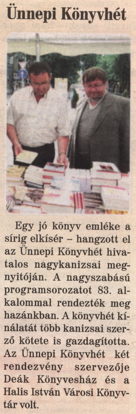Nyilvános 1857 | 4982 | Nagykanizsai Maraton 2012. június 15. 23. szám 1. oldal - Ünnepi Könyvhét | Ünnepi Könyvhét Egy jó könyv emléke a sírig elkísér - hangzott el az Ünnepi Könyvhét hivatalos nagykanizsai megnyitóján. A nagyszabású programsorozatot 83. alkalommal rendezték meg hazánkban. A könyvhét kínálatát több kanizsai szerző kötete is gazdagította. Az Ünnepi Könyvhét két rendezvény szervezője Deák Könyvesház és a Halis István Városi Könyvtár volt. |
