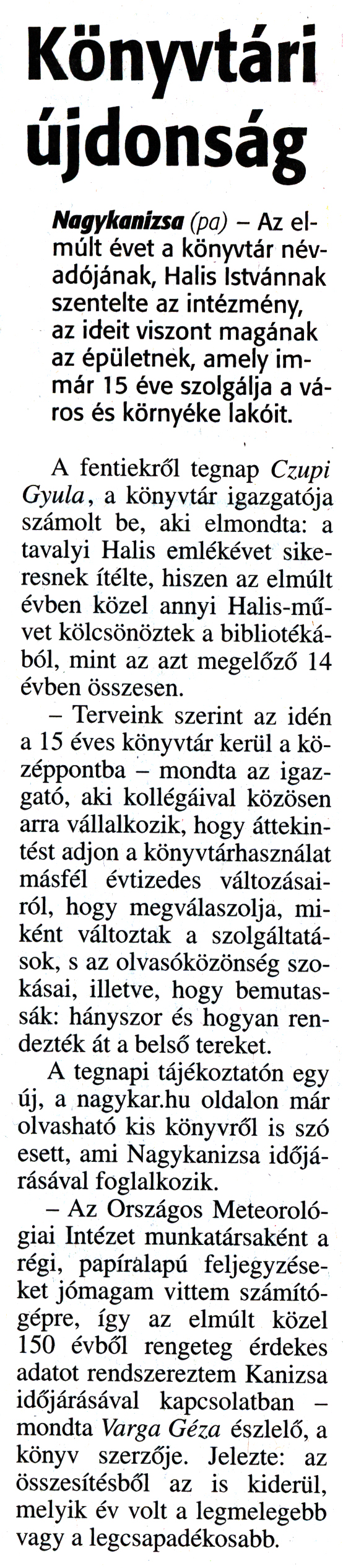 Nyilvános 1730 | 3565 | Zalai Hírlap 2016. január 6. 4. szám 3. oldal - Könyvtári újdonság | Könyvtári újdonság Nagykanizsa (pa) - Az elmúlt évet a könyvtár névadójának, Halis Istvánnak szentelte az intézmény, az ideit viszont magának az épületnek, amely immár 15 éve szolgálja a város és környéke lakóit. A fentiekről tegnap Czupi Gyula, a könyvtár igazgatója számolt be, aki elmondta: a tavalyi Halis emlékévet sikeresnek ítélte, hiszen az elmúlt évben közel annyi Halis-művet kölcsönöztek a bibliotékából, mint az azt megelőző 14 évben összesen. - Terveink szerint az idén a 15 éves könyvtár kerül a középpontba - mondta az igazgató, aki kollégáival közösen arra vállalkozik, hogy áttekintést adjon a könyvtárhasználat másfél évtizedes változásairól, hogy megválaszolja, miként változtak a szolgáltatások, s az olvasóközönség szokásai, illetve, hogy bemutassák: hányszor és hogyan rendezték át a belső tereket. A tegnapi tájékoztatón egy új, a nagykar.hu oldalon már olvasható kis könyvről is szó esett, ami Nagykanizsa időjárásával foglalkozik. - Az Országos Meteorológiai Intézet munkatársaként a régi, papíralapú feljegyzéseket jómagam vittem számítógépre, így az elmúlt közel 150 évből rengeteg érdekes adatot rendszereztem Kanizsa időjárásával kapcsolatban - mondta Varga Géza észlelő, a könyv szerzője. Jelezte: az összesítésből az is kiderül, melyik év volt a legmelegebb vagy a legcsapadékosabb. |
