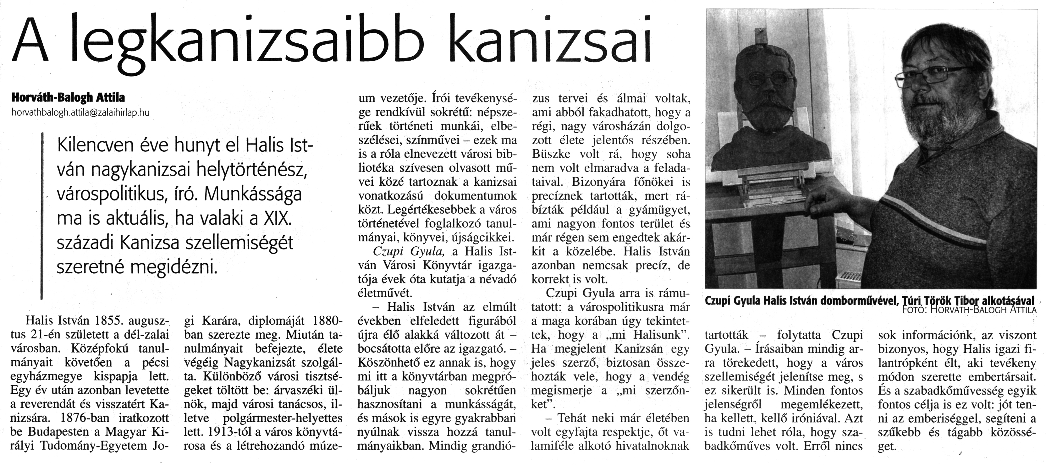Nyilvános 1818 | 3449 | Zalai Hírlap 2017. április 8. 83. szám 11. oldal - A legkanizsaibb kanizsai | A legkanizsaibb kanizsai Horváth-Balogh Attila horvathbalogh.attila@zalaihirlap.hu Kilencven éve hunyt el Halis István nagykanizsai helytörténész, várospolitikus, író. Munkássága ma is aktuális, ha valaki a XIX. századi Kanizsa szellemiségét szeretné megidézni. Halis István 1855. augusztus 21-én született a dél-zalai városban. Középfokú tanulmányait követően a pécsi egyházmegye kispapja lett. Egy év után azonban levetette a reverendát és visszatért Kanizsára. 1876-ban iratkozott be Budapesten a Magyar Királyi Tudomány-Egyetem Jogi Karára, diplomáját 1880-ban szerezte meg. Miután tanulmányait befejezte, élete végéig Nagykanizsát szolgálta. Különböző városi tisztségeket töltött be: árvaszéki ülnök, majd városi tanácsos, illetve polgármester-helyettes lett. 1913-tól a város könyvtárosa és a létrehozandó múze- um vezetője. írói tevékenysége rendkívül sokrétű: népszerűek történeti munkái, elbeszélései, színművei - ezek ma is a róla elnevezett városi bibliotéka szívesen olvasott művei közé tartoznak a kanizsai vonatkozású dokumentumok közt. Legértékesebbek a város történetével foglalkozó tanulmányai, könyvei, újságcikkei. Czupi Gyula, a Halis István Városi Könyvtár igazgatója évek óta kutatja a névadó életművét. - Halis István az elmúlt években elfeledett figurából újra élő alakká változott át -bocsátotta előre az igazgató. -Köszönhető ez annak is, hogy mi itt a könyvtárban megpróbáljuk nagyon sokrétűen hasznosítani a munkásságát, és mások is egyre gyakrabban nyúlnak vissza hozzá tanulmányaikban. Mindig grandiózus tervei és álmai voltak, ami abból fakadhatott, hogy a régi. nagy városházán dolgozott élete jelentős részében. Büszke volt rá, hogy soha nem volt elmaradva a feladataival. Bizonyára főnökei is precíznek tartották, mert rábízták például a gyámügyet, ami nagyon fontos terület és már régen sem engedtek akárkit a közelébe. Halis István azonban nemcsak precíz, de korrekt is volt. Czupi Gyula arra is rámutatott: a várospolitikusra már a maga korában úgy tekintettek, hogy a „mi Halisunk". Ha megjelent Kanizsán egy jeles szerző, biztosan összehozták vele, hogy a vendég megismerje a „mi szerzőnket". - Tehát neki már életében volt egyfajta respektje, őt valamiféle alkotó hivatalnoknak tartották - folytatta Czupi Gyula. - írásaiban mindig arra törekedett, hogy a város szellemiségét jelenítse meg, s ez sikerült is. Minden fontos jelenségről megemlékezett, ha kellett, kellő iróniával. Azt is tudni lehet róla, hogy szabadkőműves volt. Erről nincs sok információnk, az viszont bizonyos, hogy Halis igazi filantrópként élt, aki tevékeny módon szerette embertársait. És a szabadkőművesség egyik fontos célja is ez volt: jót tenni az emberiséggel, segíteni a szűkebb és tágabb közösséget. Czupi Gyula Halis István domborművével. Túri Török Tibor alkotásával Fotó: Horvath-Balogh Attila |