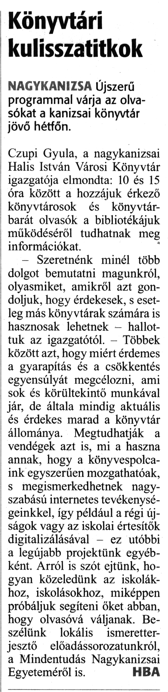 Nyilvános 1770 | 2716 | Zalai Hírlap 2018. október 5. 232. szám 7. oldal - Könyvtári kulisszatitkok | Könyvtári kulisszatitkok NAGYKANIZSA Újszerű programmal várja az olvasókat a kanizsai könyvtár jövő hétfőn. Czupi Gyula, a nagykanizsai Halis István Városi Könyvtár igazgatója elmondta: 10 és 15 óra között a hozzájuk érkező könyvtárosok és könyvtárbarát olvasók a bibliotékájuk működéséről tudhatnak meg információkat. - Szeretnénk minél több dolgot bemutatni magunkról, olyasmiket, amikről azt gondoljuk, hogy érdekesek, s esetleg más könyvtárak számára is hasznosak lehetnek - hallottuk az igazgatótól. - Többek között azt, hogy miért érdemes a gyarapítás és a csökkentés egyensúlyát megcélozni, ami sok és körültekintő munkával jár, de általa mindig aktuális és érdekes marad a könyvtár állománya. Megtudhatják a vendégek azt is, mi a haszna annak, hogy a könyvespolcaink egyszerűen mozgathatóak, s megismerkedhetnek nagyszabású internetes tevékenységeinkkel, így például a régi újságok vagy az iskolai értesítők digitalizálásával - ez utóbbi a legújabb projektünk egyébként. Arról is szót ejtünk, hogyan közeledünk az iskolákhoz, iskolásokhoz, miképpen próbáljuk segíteni őket abban, hogy olvasóvá váljanak. Beszélünk lokális ismeretterjesztő előadássorozatunkról, a Mindentudás Nagykanizsai Egyeteméről is. HBA |
