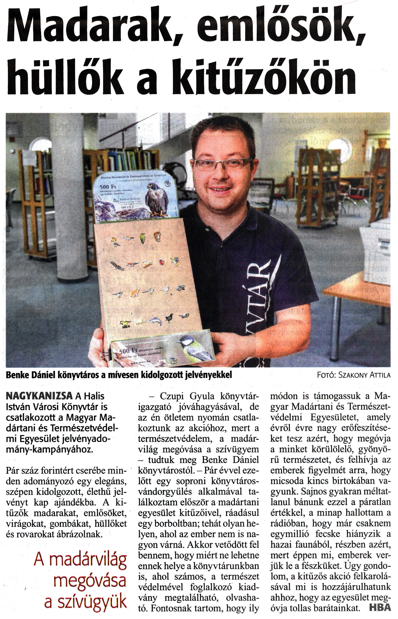 Nyilvános 1527 | 2688 | Zalai Hírlap 2019. március 18. 64. szám 6. oldal | Madarak, emlősök, hüllők a kitűzőkön Benke Dániel könyvtáros a mívesen kidolgozott jelvényekkel Fotó: Szakony Attila NAGYKANIZSA A Halis István Városi Könyvtár is csatlakozott a Magyar Madártani és Természetvédelmi Egyesület jelvényadomány-kampányához. Pár száz forintért cserébe minden adományozó egy elegáns, szépen kidolgozott, élethű jelvényt kap ajándékba. A kitűzők madarakat, emlősöket, virágokat, gombákat, hüllőket és rovarokat ábrázolnak. A madárvilág megóvása a szívügyük - Czupi Gyula könyvtárigazgató jóváhagyásával, de az én ötletem nyomán csatlakoztunk az akcióhoz, mert a természetvédelem, a madárvilág megóvása a szívügyem - tudtuk meg Benke Dániel könyvtárostól. - Pár évvel ezelőtt egy soproni könyvtárosvándorgyűlés alkalmával találkoztam először a madártani egyesület kitűzőivel, ráadásul egy borboltban; tehát olyan helyen, ahol az ember nem is nagyon várná. Akkor vetődött fel bennem, hogy miért ne lehetne ennek helye a könyvtárunkban is, ahol számos, a természet védelmével foglalkozó kiadvány megtalálható, olvasható. Fontosnak tartom, hogy ily módon is támogassuk a Magyar Madártani és Természetvédelmi Egyesületet, amely évről évre nagy erőfeszítéseket tesz azért, hogy megóvja a minket körülölelő, gyönyörű természetet, és felhívja az emberek figyelmét arra, hogy micsoda kincs birtokában vagyunk. Sajnos gyakran méltatlanul bánunk ezzel a páratlan értékkel, a minap hallottam a rádióban, hogy már csaknem egymillió fecske hiányzik a hazai faunából, részben azért, mert éppen mi, emberek verjük le a fészküket. Úgy gondolom, a kitűzős akció felkarolásával mi is hozzájárulhatunk ahhoz, hogy az egyesület megóvja tollas barátainkat. HBA |