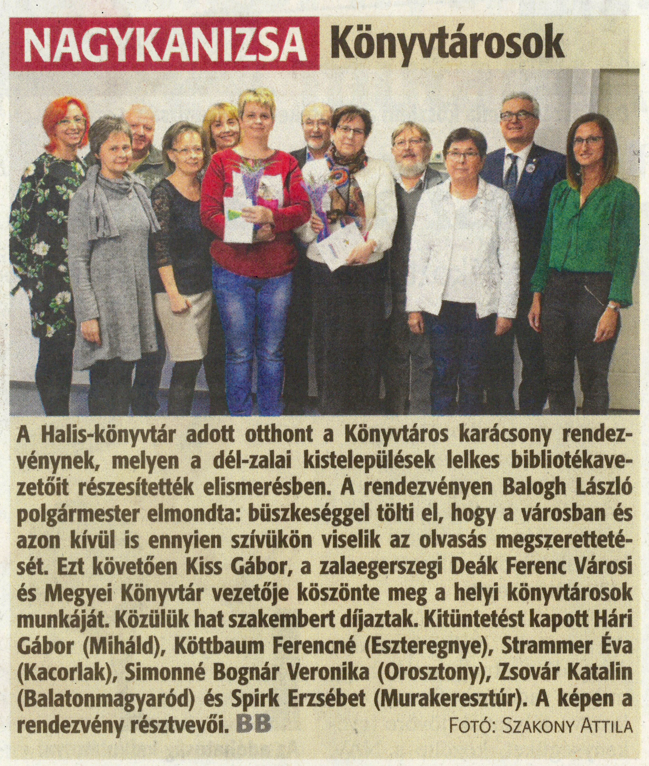Nyilvános 1363 | 2021 | Zalai Hírlap 2019. december 11. 287.sz. 3.old. - NAGYKANIZSA Könyvtárosok | A Halis-könyvtár adott otthont a Könyvtáros karácsony rendezvénynek, melyen a dél-zalai kistelepülések lelkes bibliotékavezetőit részesítették elismerésben. A rendezvényen Balogh László polgármester elmondta: büszkeséggel tölti el, hogy a városban és azon kívül is ennyien szívükön viselik az olvasás megszerettetését. Ezt követően Kiss Gábor, a zalaegerszegi Deák Ferenc Városi és Megyei Könyvtár vezetője köszönte meg a helyi könyvtárosok munkáját. Közülük hat szakembert díjaztak. Kitüntetést kapott Hári Gábor (Miháld), Köttbaum Ferencné (Eszteregnye), Strammer Éva (Kacorlak), Simonné Bognár Veronika (Orosztony), Zsovár Katalin (Balatonmagyaród) és Spirk Erzsébet (Murakeresztúr). A képen a rendezvény résztvevői. FOTÓ: SZAKONY ATTILA |