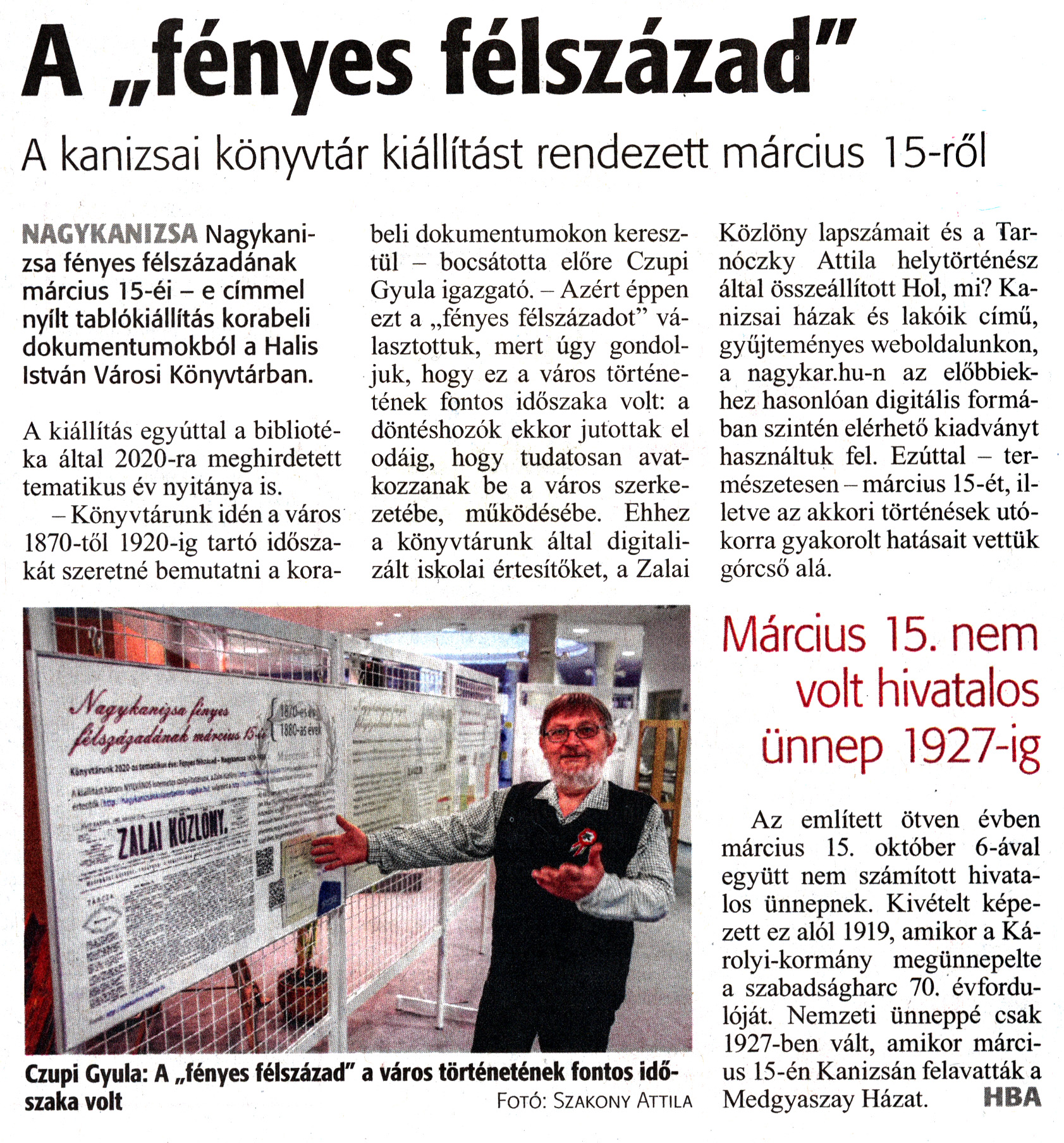 Nyilvános 1349 | 2024 | Zalai Hírlap 2020. március 14. 63. szám 7. oldal | A „fényes félszázad" A kanizsai könyvtár kiállítást rendezett március 15-ről NAGYKANIZSA Nagykanizsa fényes félszázadának március 15-éi - e címmel nyílt tablókiállítás korabeli dokumentumokból a Halis István Városi Könyvtárban. A kiállítás egyúttal a bibliotéka által 2020-ra meghirdetett tematikus év nyitánya is. - Könyvtárunk idén a város 1870-től 1920-ig tartó időszakát szeretné bemutatni a korabeli dokumentumokon keresztül - bocsátotta előre Czupi Gyula igazgató. - Azért éppen ezt a „fényes félszázadot" választottuk, mert úgy gondoljuk, hogy ez a város történetének fontos időszaka volt: a döntéshozók ekkor jutottak el odáig, hogy tudatosan avatkozzanak be a város szerkezetébe, működésébe. Ehhez a könyvtárunk által digitalizált iskolai értesítőket, a Zalai Közlöny lapszámait és a Tarnóczky Attila helytörténész által összeállított Hol, mi? Kanizsai házak és lakóik című, gyűjteményes weboldalunkon, a nagykar.hu-n az előbbiekhez hasonlóan digitális formában szintén elérhető kiadványt használtuk fel. Ezúttal - természetesen - március 15-ét, illetve az akkori történések utókorra gyakorolt hatásait vettük górcső alá. Az említett ötven évben március 15. október 6-ával együtt nem számított hivatalos ünnepnek. Kivételt képezett ez alól 1919, amikor a Károlyi-kormány megünnepelte a szabadságharc 70. évfordulóját. Nemzeti ünneppé csak 1927-ben vált, amikor március 15-én Kanizsán felavatták a Medgyaszay Házat. HBA Czupi Gyula: A „fényes félszázad" a város történetének fontos időszaka volt Fotó: Szakony Attila |