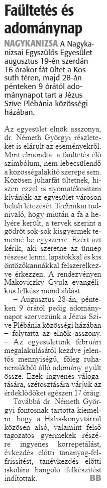 Nyilvános 1374 | 2152 | Zalai Hírlap 2020. augusztus 13. 189. szám 6. oldal | Faültetés és adománynap NAGYKANIZSA A Nagykanizsai Egyszülős Egyesület augusztus 19-én szerdán 16 órakor fát ültet a Kossuth téren, majd 28-án pénteken 9 órától adománynapot tart a Jézus Szíve Plébánia közösségi házában. Az egyesület elnök asszonya, dr. Németh Györgyi részleteket is elárult az eseményekről. Mint elmondta: a faültetés élő szimbólum, nem lebecsülendő a közösségalakító szerepe sem. Közösen juharfát ültetnek, hiszen ezzel is nyomatékosítani kívánják az egyesület városon belüli létezését. Technikai tudnivaló, hogy miután a fa a helyére került, a tervek szerint a gödröt sok-sok kisgyermek temetné be egyszerre. Ezért azt kérik, aki szeretne az ünnep részese lenni, lapátokkal és kis öntözőkannákkal felszerelkezve érkezzen. A rendezvényen Makoviczky Gyula evangélikus lelkész mond áldást. – Augusztus 28-án, pénteken 9 órától pedig adománynapot szervezünk a Jézus Szíve Plébánia közösségi házában – folytatta az elnök asszony. – Az egyesületünk februári megalakulásától kezdve jelentős mennyiségű, főleg ruhaneműkből álló adomány gyűlt össze. Ezek ingyenes válogatására, szétosztására várjuk az érdeklődőket egészen 17 óráig. Továbbá dr. Németh Györgyi fontosnak tartotta kiemelni, hogy a Halis-könyvtárral közösen alsó, valamint felső tagozatos gyermekek részére ingyenes korrepetálást, frissítést, tanévkezdés előtti iskolára hangoló felkészítést indítottak. BB |