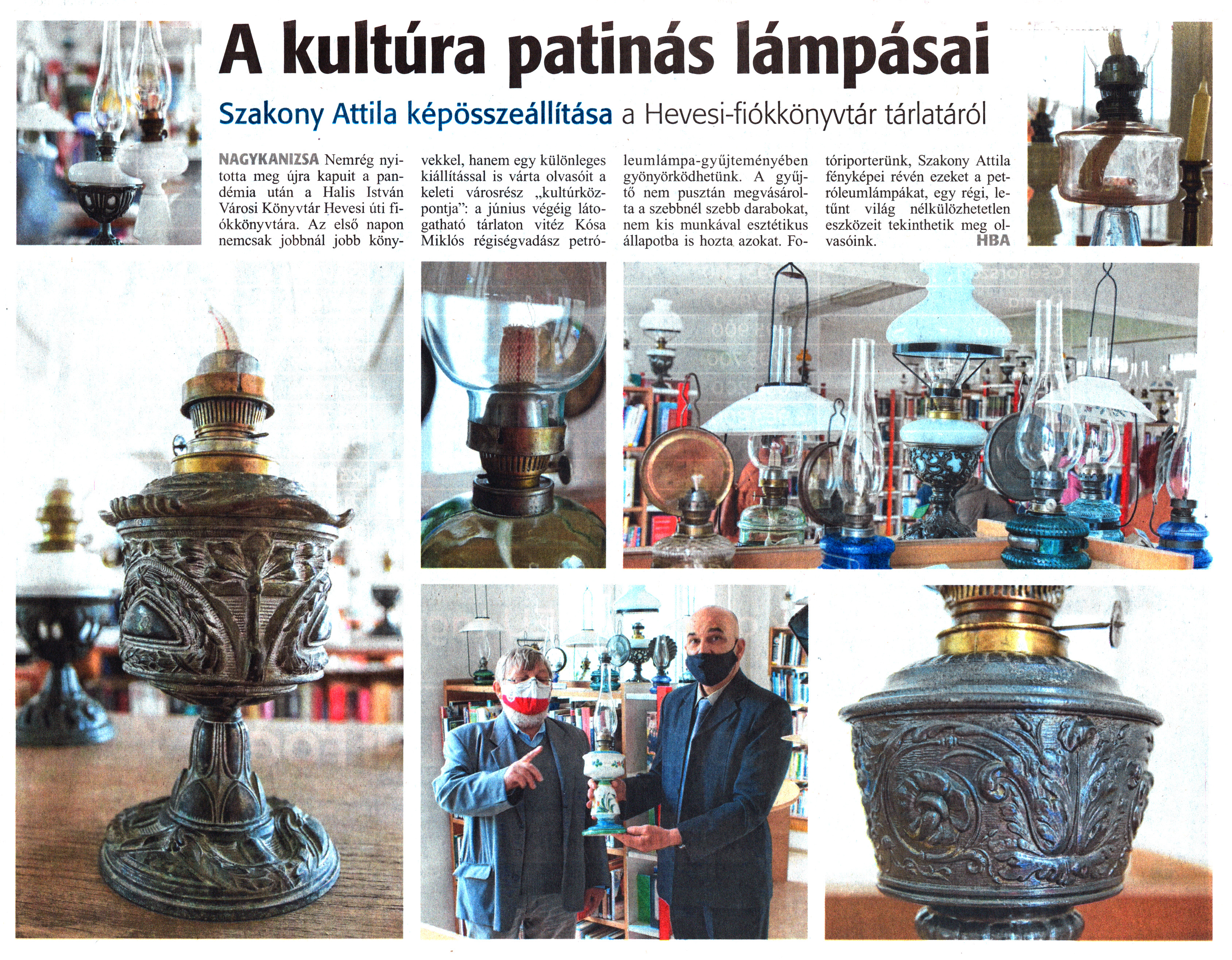 Nyilvános 1264 | 1999 | Zalai Hírlap 2021. május 26. 119. szám 5. oldal | A kultúra patinás lámpásai Szakony Attila képösszeállítása a Hevesi-fiókkönyvtár tárlatáról NAGYKANIZSA Nemrég nyitotta meg újra kapuit a pandémia után a Halis István Városi Könyvtár Hevesi úti fiókkönyvtára. Az első napon nemcsak jobbnál jobb könyvekkel, hanem egy különleges kiállítással is várta olvasóit a keleti városrész „kultúrközpontja": a június végéig látogatható tárlaton vitéz Kósa Miklós régiségvadász petróleumlámpa-gyűjteményében gyönyörködhetünk. A gyűjtő nem pusztán megvásárolta a szebbnél szebb darabokat, nem kis munkával esztétikus állapotba is hozta azokat. Fotóriporterünk, Szakony Attila fényképei révén ezeket a petróleumlámpákat, egy régi, letűnt világ nélkülözhetetlen eszközeit tekinthetik meg olvasóink. HBA |