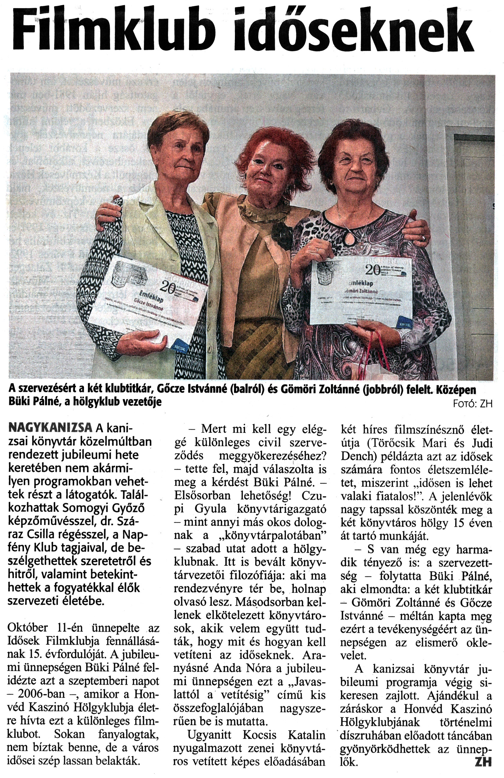 Nyilvános 1205 | 1704 | Zalai Hírlap 2021. október 15. 240. szám 12. oldal | Filmklub időseknek A szervezésért a két klubtitkár, Gőcze Istvánné (balról) és Gömöri Zoltánné (jobbról) felelt. Középen Büki Pálné, a hölgyklub vezetője Fotó: ZH NAGYKANIZSA A kanizsai könyvtár közelmúltban rendezett jubileumi hete keretében nem akármilyen programokban vehettek részt a látogatók. Találkozhattak Somogyi Győző képzőművésszel, dr. Száraz Csilla régésszel, a Napfény Klub tagjaival, de beszélgethettek szeretetről és hitről, valamint betekinthettek a fogyatékkal élők szervezeti életébe. Október 11-én ünnepelte az Idősek Filmklubja fennállásának 15. évfordulóját. A jubileumi ünnepségen Büki Pálné felidézte azt a szeptemberi napot - 2006-ban -, amikor a Honvéd Kaszinó Hölgyklubja életre hívta ezt a különleges filmklubot. Sokan fanyalogtak, nem bíztak benne, de a város idősei szép lassan belakták. - Mert mi kell egy eléggé különleges civil szerveződés meggyökerezéséhez? - tette fel, majd válaszolta is meg a kérdést Büki Pálné. - Elsősorban lehetőség! Czupi Gyula könyvtárigazgató - mint annyi más okos dolognak a „könyvtárpalotában" - szabad utat adott a hölgyklubnak. Itt is bevált könyvtárvezetői filozófiája: aki ma rendezvényre tér be, holnap olvasó lesz. Másodsorban kellenek elkötelezett könyvtárosok, akik velem együtt tudták, hogy mit és hogyan kell vetíteni az időseknek. Aranyásné Anda Nóra a jubileumi ünnepségen ezt a „Javaslattól a vetítésig" című kis összefoglalójában nagyszerűen be is mutatta. Ugyanitt Kocsis Katalin nyugalmazott zenei könyvtáros vetített képes előadásában két híres filmszínésznő életútja (Törőcsik Mari és Judi Dench) példázta azt az idősek számára fontos életszemléletet, miszerint „idősen is lehet valaki fiatalos!". A jelenlévők nagy tapssal köszönték meg a két könyvtáros hölgy 15 éven át tartó munkáját. - S van még egy harmadik tényező is: a szervezettség - folytatta Büki Pálné, aki elmondta: a két klubtitkár - Gömöri Zoltánné és Gőcze Istvánné - méltán kapta meg ezért a tevékenységéért az ünnepségen az elismerő oklevelet. A kanizsai könyvtár jubileumi programja végig sikeresen zajlott. Ajándékul a záráskor a Honvéd Kaszinó Hölgyklubjának történelmi díszruhában előadott táncában gyönyörködhettek az ünneplők. ZH |
