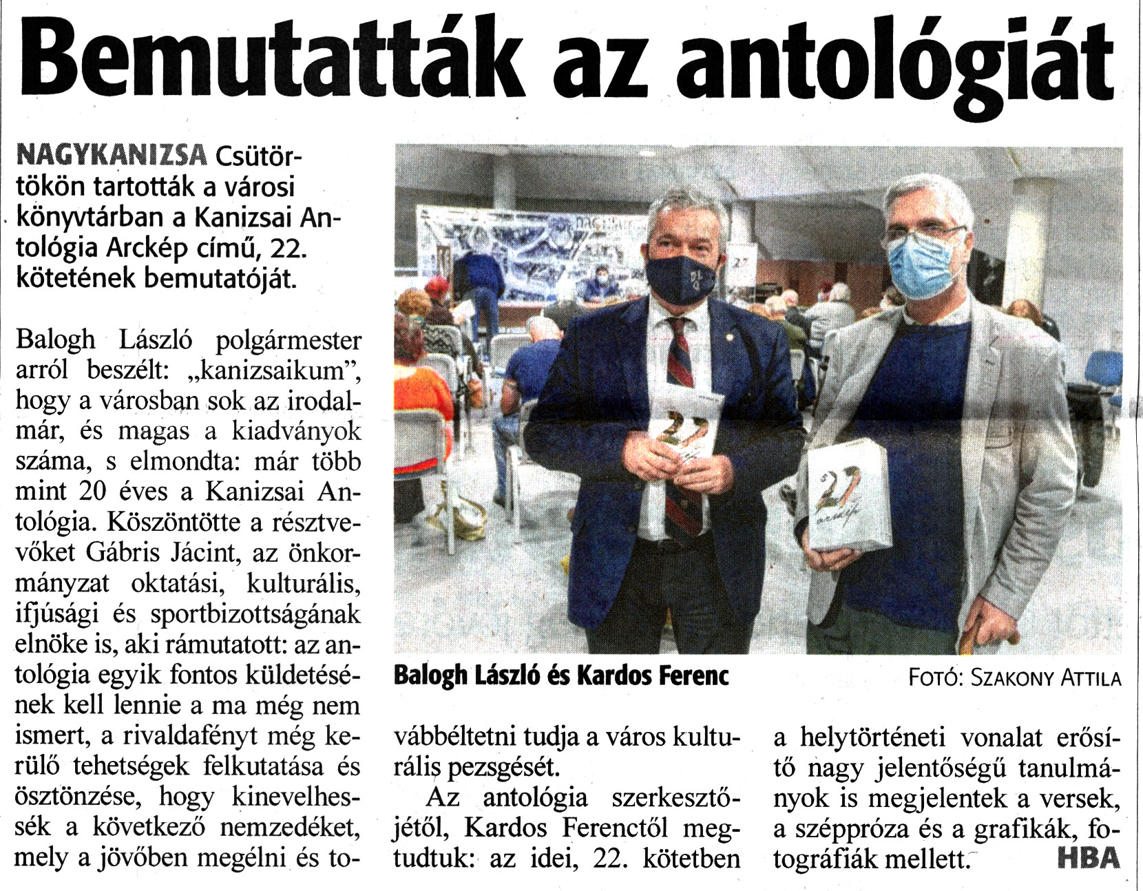 Nyilvános 1188 | 1725 | Zalai Hírlap 2021. december 11. 287. szám 16. oldal | Bemutatták az antológiát NAGYKANIZSA Csütörtökön tartották a városi könyvtárban a Kanizsai Antológia Arckép című, 22. kötetének bemutatóját. Balogh László polgármester arról beszélt: „kanizsaikum", hogy a városban sok az irodalmár, és magas a kiadványok száma, s elmondta: már több mint 20 éves a Kanizsai Antológia. Köszöntötte a résztvevőket Gábris Jácint, az önkormányzat oktatási, kulturális, ifjúsági és sportbizottságának elnöke is, aki rámutatott: az antológia egyik fontos küldetésének kell lennie a ma még nem ismert, a rivaldafényt még kerülő tehetségek felkutatása és ösztönzése, hogy kinevelhessék a következő nemzedéket, mely a jövőben megélni és továbbéltetni tudja a város kulturális pezsgését. Az antológia szerkesztőjétől, Kardos Ferenctől megtudtuk: az idei, 22. kötetben a helytörténeti vonalat erősítő nagy jelentőségű tanulmányok is megjelentek a versek, a széppróza és a grafikák, fotográfiák mellett. HBA Balogh László és Kardos Ferenc Fotó: Szakony Attila |