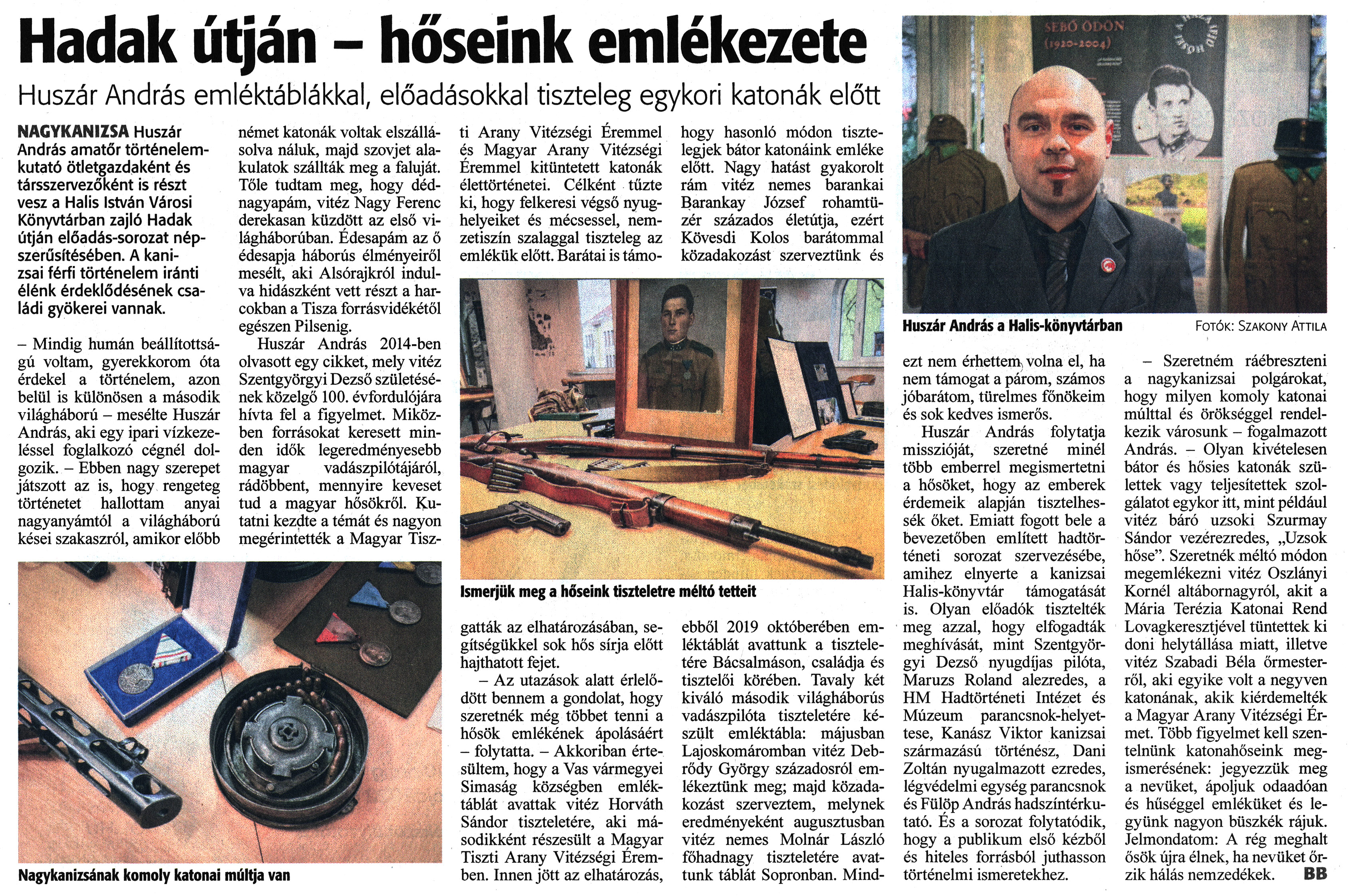 Nyilvános 1094 | 1480 | Zalai Hírlap 2023. február 8. 33. szám 4. oldal | Hadak útján - hőseink emlékezete Huszár András emléktáblákkal, előadásokkal tiszteleg egykori katonák előtt NAGYKANIZSA Huszár András amatőr történelemkutató ötletgazdaként és társszervezőként is részt vesz a Halis István Városi Könyvtárban zajló Hadak útján előadás-sorozat népszerűsítésében. A kanizsai férfi történelem iránti élénk érdeklődésének családi gyökerei vannak. - Mindig humán beállítottságú voltam, gyerekkorom óta érdekel a történelem, azon belül is különösen a második világháború - mesélte Huszár András, aki egy ipari vízkezeléssel foglalkozó cégnél dolgozik. - Ebben nagy szerepet játszott az is, hogy rengeteg történetet hallottam anyai nagyanyámtól a világháború kései szakaszról, amikor előbb német katonák voltak elszállásolva náluk, majd szovjet alakulatok szállták meg a faluját. Tőle tudtam meg, hogy dédnagyapám, vitéz Nagy Ferenc derekasan küzdött az első világháborúban. Édesapám az ő édesapja háborús élményeiről mesélt, aki Alsórajkról indulva hidászként vett részt a harcokban a Tisza forrásvidékétől egészen Pilsenig. Huszár András 2014-ben olvasott egy cikket, mely vitéz Szentgyörgyi Dezső születésének közelgő 100. évfordulójára hívta fel a figyelmet. Miközben forrásokat keresett minden idők legeredményesebb magyar vadászpilótájáról, rádöbbent, mennyire keveset tud a magyar hősökről. Kutatni kezdte a témát és nagyon megérintették a Magyar Tiszti Arany Vitézségi Éremmel és Magyar Arany Vitézségi Éremmel kitüntetett katonák élettörténetei. Célként tűzte ki, hogy felkeresi végső nyughelyeiket és mécsessel, nemzetiszín szalaggal tiszteleg az emlékük előtt. Barátai is támogatták az elhatározásában, segítségükkel sok hős sírja előtt hajthatott fejet. - Az utazások alatt érlelődött bennem a gondolat, hogy szeretnék még többet tenni a hősök emlékének ápolásáért - folytatta. - Akkoriban értesültem, hogy a Vas vármegyei Simaság községben emléktáblát avattak vitéz Horváth Sándor tiszteletére, aki másodikként részesült a Magyar Tiszti Arany Vitézségi Éremben. Innen jött az elhatározás, hogy hasonló módon tisztelegjek bátor katonáink emléke előtt. Nagy hatást gyakorolt rám vitéz nemes barankai Barankay József rohamtüzér százados életútja, ezért Kövesdi Kolos barátommal közadakozást szerveztünk és ebből 2019 októberében emléktáblát avattunk a tiszteletére Bácsalmáson, családja és tisztelői körében. Tavaly két kiváló második világháborús vadászpilóta tiszteletére készült emléktábla: májusban Lajoskomáromban vitéz Debrődy György századosról emlékeztünk meg; majd közadakozást szerveztem, melynek eredményeként augusztusban vitéz nemes Molnár László főhadnagy tiszteletére avattunk táblát Sopronban. Mindezt nem érhettem, volna el, ha nem támogat a párom, számos jóbarátom, türelmes főnökeim és sok kedves ismerős. Huszár András folytatja misszióját, szeretné minél több emberrel megismertetni a hősöket, hogy az emberek érdemeik alapján tisztelhessék őket. Emiatt fogott bele a bevezetőben említett hadtörténeti sorozat szervezésébe, amihez elnyerte a kanizsai Halis-könyvtár támogatását is. Olyan előadók tisztelték meg azzal, hogy elfogadták meghívását, mint Szentgyörgyi Dezső nyugdíjas pilóta, Maruzs Roland alezredes, a HM Hadtörténeti Intézet és Múzeum parancsnok-helyet-tese, Kanász Viktor kanizsai származású történész, Dani Zoltán nyugalmazott ezredes, légvédelmi egység parancsnok és Fülöp András hadszíntérkutató. És a sorozat folytatódik, hogy a publikum első kézből és hiteles forrásból juthasson történelmi ismeretekhez. Fotók: Szakony Attila - Szeretném ráébreszteni a nagykanizsai polgárokat, hogy milyen komoly katonai múlttal és örökséggel rendelkezik városunk - fogalmazott András. - Olyan kivételesen bátor és hősies katonák születtek vagy teljesítettek szolgálatot egykor itt, mint például vitéz báró uzsoki Szurmay Sándor vezérezredes, „Uzsok hőse". Szeretnék méltó módon megemlékezni vitéz Oszlányi Kornél altábornagyról, akit a Mária Terézia Katonai Rend Lovagkeresztjével tüntettek ki doni helytállása miatt, illetve vitéz Szabadi Béla őrmesterről, aki egyike volt a negyven katonának, akik kiérdemelték a Magyar Arany Vitézségi Érmet. Több figyelmet kell szentelnünk katonahőseink megismerésének: jegyezzük meg a nevüket, ápoljuk odaadóan és hűséggel emléküket és legyünk nagyon büszkék rájuk. Jelmondatom: A rég meghalt ősök újra élnek, ha nevüket őrzik hálás nemzedékek. BB Nagykanizsának komoly katonai múltja van Ismerjük meg a hőseink tiszteletre méltó tetteit |