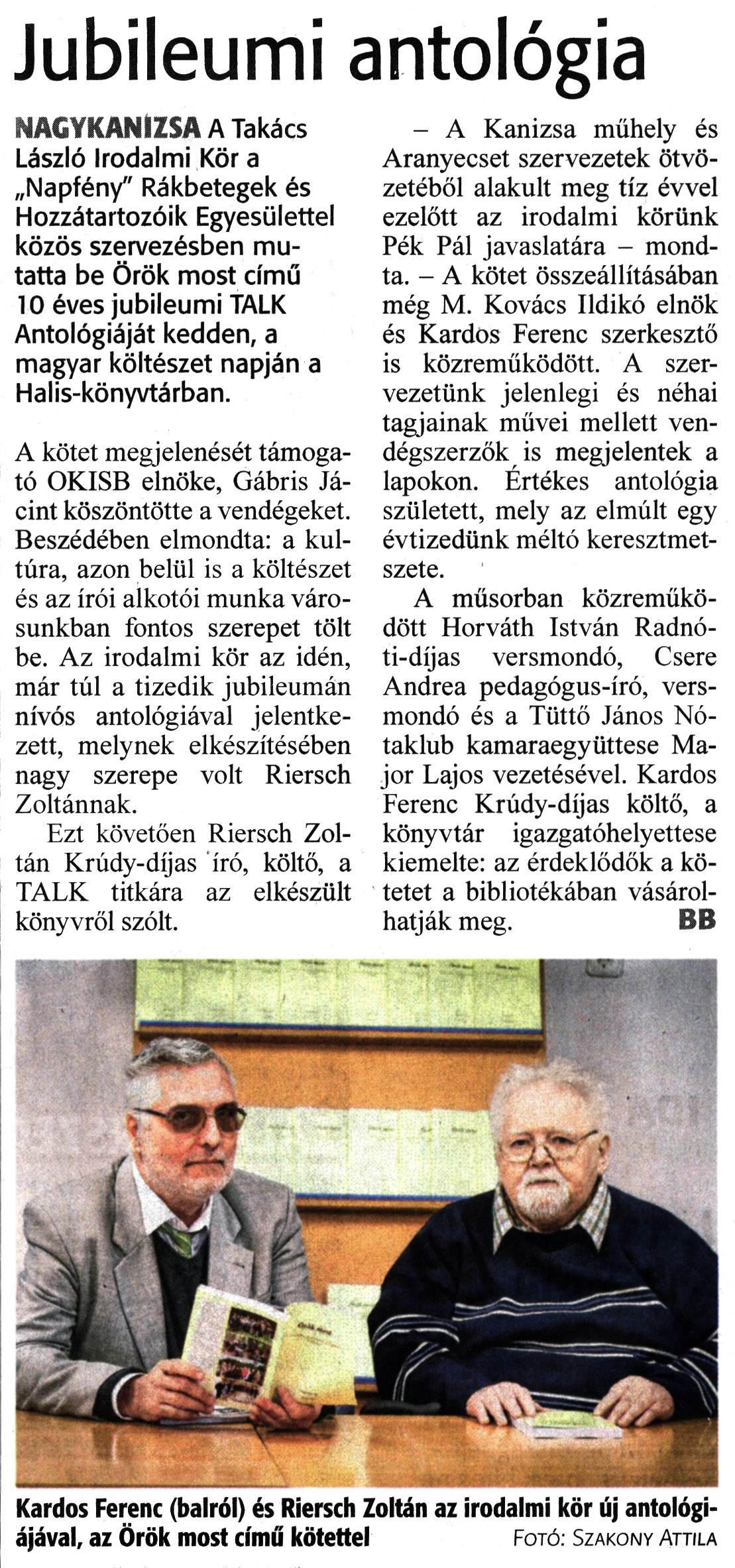 Nyilvános 1081 | 1326 | Zalai Hírlap 2023. április 13. 85. szám 2. oldal | Jubileumi antológia NAGYKANIZSA A Takács László Irodalmi Kör a „Napfény" Rákbetegek és Hozzátartozóik Egyesülettel közös szervezésben mutatta be Örök most című 10 éves jubileumi TALK Antológiáját kedden, a magyar költészet napján a Halis-könyvtárban. A kötet megjelenését támogató OKISB elnöke, Gábris Jácint köszöntötte a vendégeket. Beszédében elmondta: a kultúra, azon belül is a költészet és az írói alkotói munka városunkban fontos szerepet tölt be. Az irodalmi kör az idén, már túl a tizedik jubileumán nívós antológiával jelentkezett, melynek elkészítésében nagy szerepe volt Riersch Zoltánnak. Ezt követően Riersch Zoltán Krúdy-díjas író, költő, a TALK titkára az elkészült könyvről szólt. - A Kanizsa műhely és Aranyecset szervezetek ötvözetéből alakult meg tíz évvel ezelőtt az irodalmi körünk Pék Pál javaslatára - mondta. - A kötet összeállításában még M. Kovács Ildikó elnök és Kardos Ferenc szerkesztő is közreműködött. A szervezetünk jelenlegi és néhai tagjainak művei mellett vendégszerzők is megjelentek a lapokon. Értékes antológia született, mely az elmúlt egy évtizedünk méltó keresztmetszete. A műsorban közreműködött Horváth István Radnóti-díjas versmondó, Csere Andrea pedagógus-író, versmondó és a Tüttő János Nótaklub kamaraegyüttese Major Lajos vezetésével. Kardos Ferenc Krúdy-díjas költő, a könyvtár igazgatóhelyettese kiemelte: az érdeklődők a kötetet a bibliotékában vásárolhatják meg. BB Kardos Ferenc (balról) és Riersch Zoltán az irodalmi kör új antológiájával, az Örök most című kötettel Fotó. Szakony Attila |