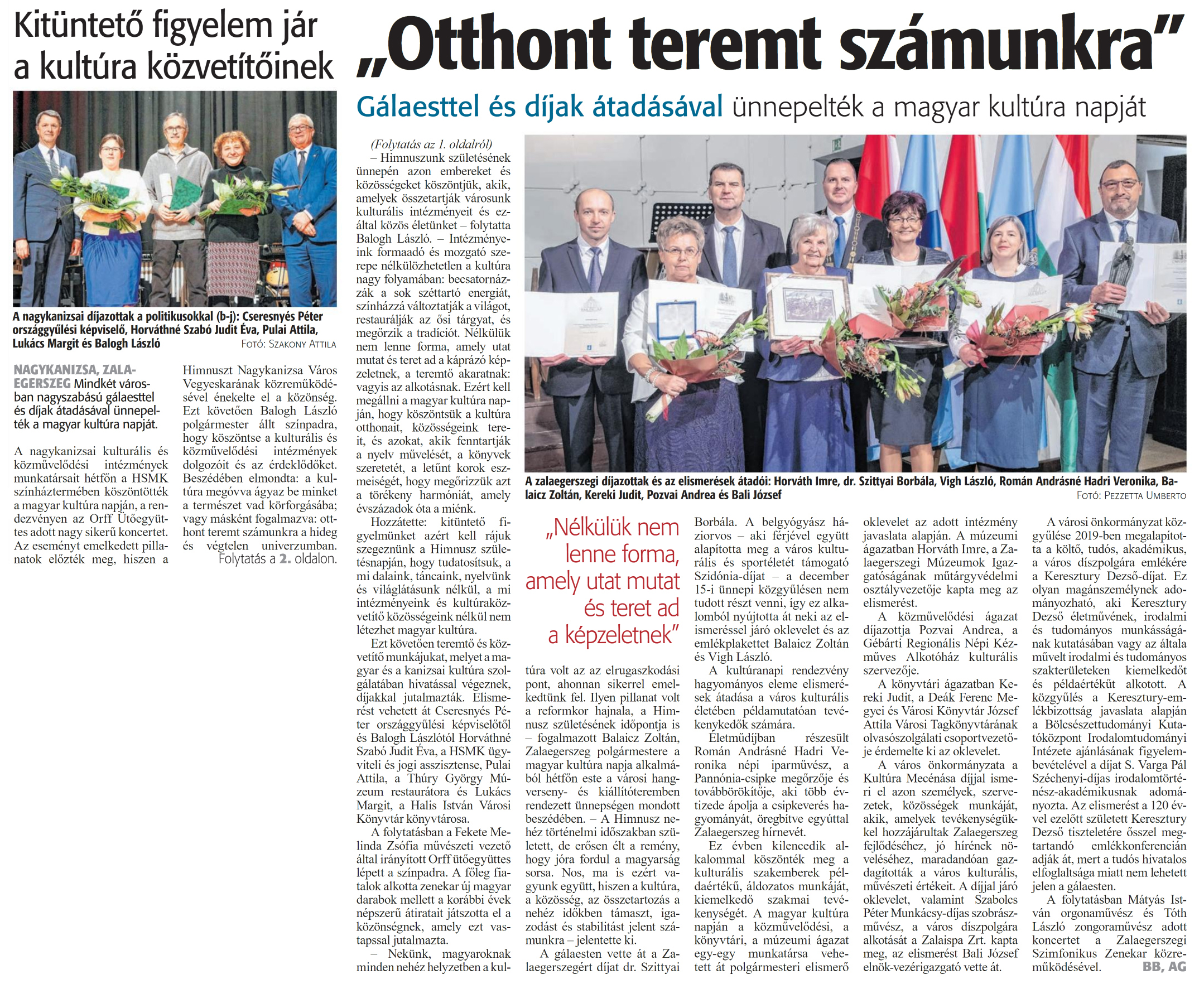 Nyilvános 1073 | 1946 | Zalai Hírlap 2024. január 24. 20. szám 1-2. oldal | Kitüntető figyelem jár a kultúra közvetítőinek A nagykanizsai díjazottak a politikusokkal (b-j): Cseresnyés Péter országgyűlési képviselő, Horváthné Szabó Judit Éva, Pulai Attila, Lukács Margit és Balogh László Fotó: Szakony Attila NAGYKANIZSA, ZALAEGERSZEG Mindkét városban nagyszabású gálaesttel és díjak átadásával ünnepelték a magyar kultúra napját. A nagykanizsai kulturális és közművelődési intézmények munkatársait hétfőn a HSMK színháztermében köszöntötték a magyar kultúra napján, a rendezvényen az Orff Ütőegyüttes adott nagy sikerű koncertet. Az eseményt emelkedett pillanatok előzték meg, hiszen a Himnuszt Nagykanizsa Város Vegyeskarának közreműködésével énekelte el a közönség. Ezt követően Balogh László polgármester állt színpadra, hogy köszöntse a kulturális és közművelődési intézmények dolgozóit és az érdeklődőket. Beszédében elmondta: a kultúra megóvva ágyaz be minket a természet vad körforgásába; vagy másként fogalmazva: otthont teremt számunkra a hideg és végtelen univerzumban. Folytatás a 2. oldalon. „Otthont teremt számunkra" Gálaesttel és díjak átadásával ünnepelték a magyar kultúra napját A zalaegerszegi díjazottak és az elismerések átadói: Horváth Imre, dr. Szittyái Borbála, Vigh László, Román Andrásné Hadri Veronika, Balaicz Zoltán, Kereki Judit, Pozvai Andrea és Bali József Fotó: Pezzetta Umberto (Folytatás az 1. oldalról) - Himnuszunk születésének ünnepén azon embereket és közösségeket köszöntjük, akik, amelyek összetartják városunk kulturális intézményeit és ezáltal közös életünket - folytatta Balogh László. - Intézményeink formaadó és mozgató szerepe nélkülözhetetlen a kultúra nagy folyamában: becsatornázzák a sok széttartó energiát, színházzá változtatják a világot, restaurálják az ősi tárgyat, és megőrzik a tradíciót. Nélkülük nem lenne forma, amely utat mutat és teret ad a káprázó képzeletnek, a teremtő akaratnak: vagyis az alkotásnak. Ezért kell megállni a magyar kultúra napján, hogy köszöntsük a kultúra otthonait, közösségeink tereit, és azokat, akik fenntartják a nyelv művelését, a könyvek szeretetét, a letűnt korok eszmeiségét, hogy megőrizzük azt a törékeny harmóniát, amely évszázadok óta a miénk. Hozzátette: kitüntető figyelmünket azért kell rájuk szegeznünk a Himnusz születésnapján, hogy tudatosítsuk, a mi dalaink, táncaink, nyelvünk és világlátásunk nélkül, a mi intézményeink és kultúraközvetítő közösségeink nélkül nem létezhet magyar kultúra. Ezt követően teremtő és közvetítő munkájukat, melyet a magyar és a kanizsai kultúra szolgálatában hivatással végeznek, díjakkal jutalmazták. Elismerést vehetett át Cseresnyés Péter országgyűlési képviselőtől és Balogh Lászlótól Horváthné Szabó Judit Éva, a HSMK ügyviteli és jogi asszisztense, Pulai Attila, a Thúry György Múzeum restaurátora és Lukács Margit, a Malis István Városi Könyvtár könyvtárosa. A folytatásban a Fekete Melinda Zsófia művészeti vezető által irányított Orff ütőegyüttes lépett a színpadra. A főleg fiatalok alkotta zenekar új magyar darabok mellett a korábbi évek népszerű átiratait játszotta el a közönségnek, amely ezt vastapssal jutalmazta. - Nekünk, magyaroknak minden nehéz helyzetben a kultúra volt az az elrugaszkodási pont, ahonnan sikerrel emelkedtünk fel. Ilyen pillanat volt a reformkor hajnala, a Himnusz születésének időpontja is - fogalmazott Balaicz Zoltán, Zalaegerszeg polgármestere a magyar kultúra napja alkalmából hétfőn este a városi hangverseny- és kiállítóteremben rendezett ünnepségen mondott beszédében. - A Himnusz nehéz történelmi időszakban született, de erősen élt a remény, hogy jóra fordul a magyarság sorsa. Nos, ma is ezért vagyunk együtt, hiszen a kultúra, a közösség, az összetartozás a nehéz időkben támaszt, igazodást és stabilitást jelent számunkra -jelentette ki. A gálaesten vette át a Zalaegerszegért díjat dr. Szittyai Borbála. A belgyógyász háziorvos - aki férjével együtt alapította meg a város kulturális és sportéletét támogató Szidónia-díjat - a december 15-i ünnepi közgyűlésen nem tudott részt venni, így ez alkalomból nyújtotta át neki az elismeréssel járó oklevelet és az emlékplakettet Balaicz Zoltán és Vigh László. A kultúranapi rendezvény hagyományos eleme elismerések átadása a város kulturális életében példamutatóan tevékenykedők számára. Életműdíjban részesült Román Andrásné Hadri Veronika népi iparművész, a Pannónia-csipke megőrzője és továbbörökítője, aki több évtizede ápolja a csipkeverés hagyományát, öregbítve egyúttal Zalaegerszeg hírnevét. Ez évben kilencedik alkalommal köszönték meg a kulturális szakemberek példaértékű, áldozatos munkáját, kiemelkedő szakmai tevékenységét. A magyar kultúra napján a közművelődési, a könyvtári, a múzeumi ágazat egy-egy munkatársa vehetett át polgármesteri elismerő oklevelet az adott intézmény javaslata alapján. A múzeumi ágazatban Horváth Imre, a Zalaegerszegi Múzeumok Igazgatóságának műtárgyvédelmi osztályvezetője kapta meg az elismerést. A közművelődési ágazat díjazottja Pozvai Andrea, a Gébárti Regionális Népi Kézműves Alkotóház kulturális szervezője. A könyvtári ágazatban Kereki Judit, a Deák Ferenc Megyei és Városi Könyvtár József Attila Városi Tagkönyvtárának olvasószolgálati csoportvezetője érdemelte ki az oklevelet. A város önkormányzata a Kultúra Mecénása díjjal ismeri el azon személyek, szervezetek, közösségek munkáját, akik, amelyek tevékenységükkel hozzájárultak Zala