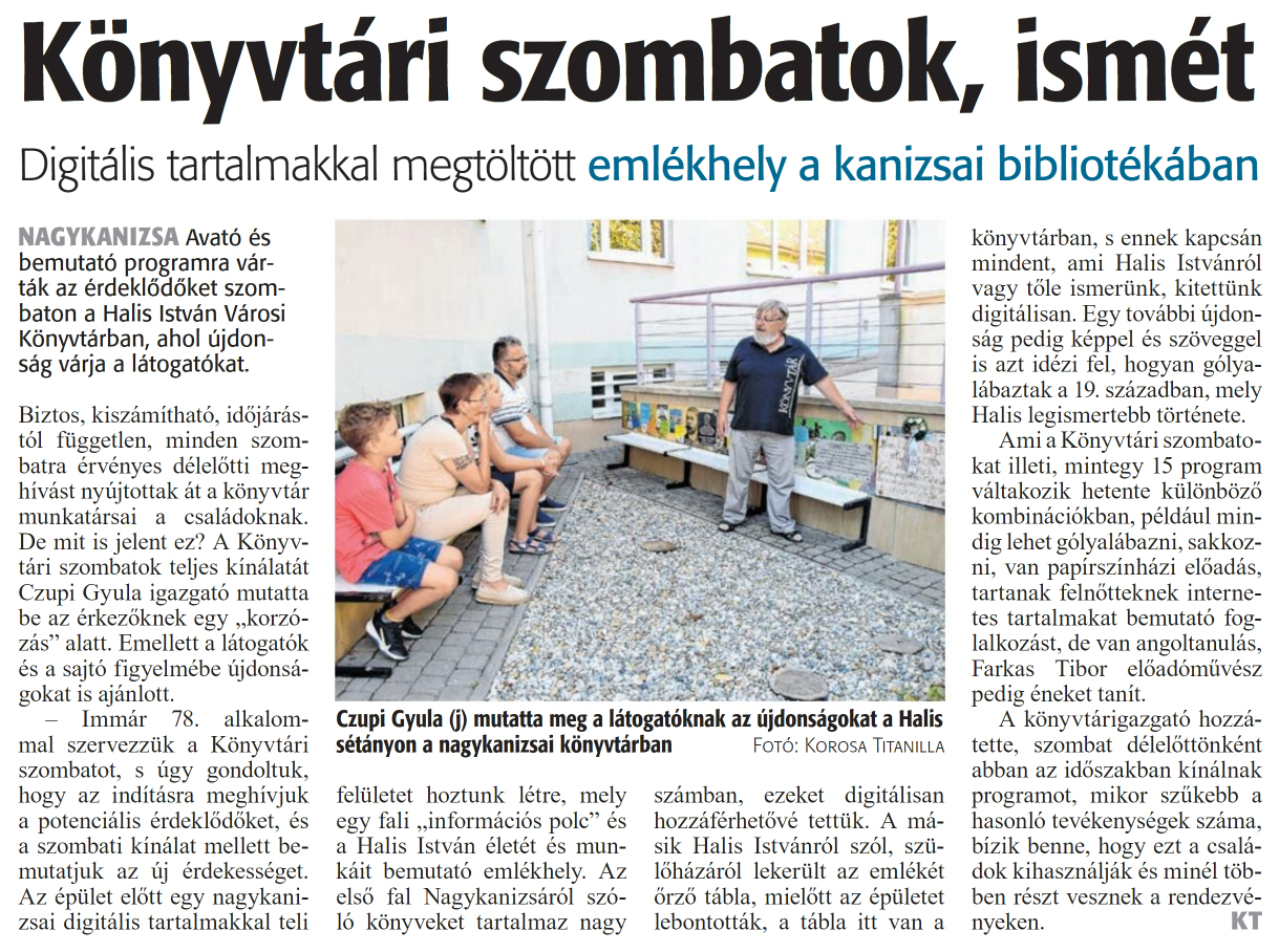 Nyilvános 930 | 1209 | Zalai Hírlap 2024. szeptember 9. 210. szám 4. oldal | Könyvtári szombatok, ismét Digitális tartalmakkal megtöltött emlékhely a kanizsai bibliotékában NAGYKANIZSA Avató és bemutató programra várták az érdeklődőket szombaton a Halis István Városi Könyvtárban, ahol újdonság várja a látogatókat. Biztos, kiszámítható, időjárástól független, minden szombatra érvényes délelőtti meghívást nyújtottak át a könyvtár munkatársai a családoknak. De mit is jelent ez? A Könyvtári szombatok teljes kínálatát Czupi Gyula igazgató mutatta be az érkezőknek egy „korzózás" alatt. Emellett a látogatók és a sajtó figyelmébe újdonságokat is ajánlott. - Immár 78. alkalommal szervezzük a Könyvtári szombatot, s úgy gondoltuk, hogy az indításra meghívjuk a potenciális érdeklődőket, és a szombati kínálat mellett bemutatjuk az új érdekességet. Az épület előtt egy nagykanizsai digitális tartalmakkal teli felületet hoztunk létre, mely egy fali „információs polc" és a Halis István életét és munkáit bemutató emlékhely. Az első fal Nagykanizsáról szóló könyveket tartalmaz nagy számban, ezeket digitálisan hozzáférhetővé tettük. A másik Halis Istvánról szól, szülőházáról lekerült az emlékét őrző tábla, mielőtt az épületet lebontották, a tábla itt van a könyvtárban, s ennek kapcsán mindent, ami Halis Istvánról vagy tőle ismerünk, kitettünk digitálisan. Egy további újdonság pedig képpel és szöveggel is azt idézi fel, hogyan gólyalábaztak a 19. században, mely Halis legismertebb története. Ami a Könyvtári szombatokat illeti, mintegy 15 program váltakozik hetente különböző kombinációkban, például mindig lehet gólyalábazni, sakkozni, van papírszínházi előadás, tartanak felnőtteknek internetes tartalmakat bemutató foglalkozást, de van angoltanulás, Farkas Tibor előadóművész pedig éneket tanít. A könyvtárigazgató hozzátette, szombat délelőttönként abban az időszakban kínálnak programot, mikor szűkebb a hasonló tevékenységek száma, bízik benne, hogy ezt a családok kihasználják és minél többen részt vesznek a rendezvényeken. KT Czupi Gyula (j) mutatta meg a látogatóknak az újdonságokat a Halis sétányon a nagykanizsai könyvtárban Fotó: Korosa Titanilla |