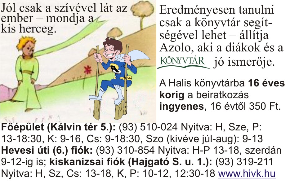 Nyilvános 1117 | 2536 | Jól csak a szívével lát az ember – mondja a kis herceg. | Eredményesen tanulni csak a könyvtár segítségével lehet – állítja Azolo, aki a diákok és a könyvtár jó ismerője. A Halis könyvtárba 16 éves korig a beiratkozás ingyenes, 16 évtől 350 Ft. Főépület (Kálvin tér 5.): (93) 510-024 Nyitva: H, Sze, P: 13-18:30, K: 9-16, Cs: 9-18:30, Szo (kivéve júl-aug): 9-13 Hevesi úti (6.) fiók: (93) 310-854 Nyitva: H-P 13-18, szerdán 9-12-ig is; kiskanizsai fiók (Hajgató S. u. 1.): (93) 319-211 Nyitva: H, Sz, Cs: 13-18, K, P: 10-12, 12:30-18 www.hivk.hu |