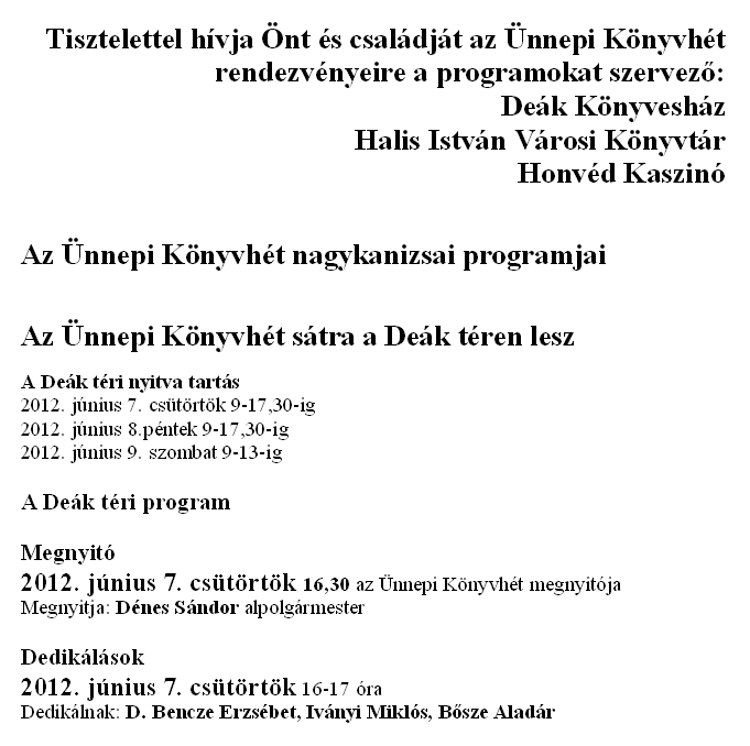 Nyilvános 1270 | 2551 | Rövid leírás | Teljes leírás (859 B) | Tisztelettel hívja Önt és családját az Ünnepi Könyvhét rendezvényeire a programokat szervező: Deák Könyvesház Halis István Városi Könyvtár Honvéd Kaszinó Az Ünnepi Könyvhét nagykanizsai programjai Az Ünnepi Könyvhét sátra a Deák téren lesz A Deák téri nyitva tartás 2012. június 7. csütörtök 9-17,30-ig 2012. június 8.péntek 9-17,30-ig 2012. június 9. szombat 9-13-ig A Deák téri program Megnyitó 2012. június 7. csütörtök 16,30 az Ünnepi Könyvhét megnyitója Megnyitja: Dénes Sándor alpolgármester Dedikálások 2012. június 7. csütörtök 16-17 óra Dedikálnak: D. Bencze Erzsébet, Iványi Miklós, Bősze Aladár |
