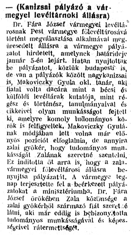 Nyilvános 1145 | 2238 | Zalai Közlöny 1939. január 14. 11. szám 5. oldal - Kanizsai pályázó a vármegyei levéltárnoki állásra | – (Kanizsai pályázó a vármegyei levéltárnoki állásra) Dr. Fára József vármegyei levéltárosnak Pest vármegye főlevéltárosává történt megválasztása alkalmával megüresedett állásra a vármegye pályázatot hirdetett, amelynek határideje január 5-én lejárt. Hatan nyújtottak be pályázatot, köztük budapesti is, de van a pályázók között nagykanizsai is, Makoviczky Gyula okl. tanár, aki fiatal volta dacára mint a bécsi és külföldi levéltárak kutatója, mint régész és történész, tanulmányaival és cikkeivel olyan munkásságot fejtett ki, amelyre komoly tudományos körök is felfigyeltek. Makoviczky Gyulának módjában lett volna már előnyös poziciót elfoglalnia, de annyira zalai gyökér, hogy tudományos munkásságát Zalának szeretné szentelni. Ez indította őt arra is, hogy a zalavármegyei főlevéltárosi állásra benyújtsa pályázatát. A vármegye tegnap terjesztette fel a beérkezett pályázatokat a minisztériumba. Dr. Fára József örökében Zala közönsége a zalai gyökérből származó fiát szeretné látni, aki már eddig is bebizonyította tudományos munkásságával és képességeivel rátermettségét. |