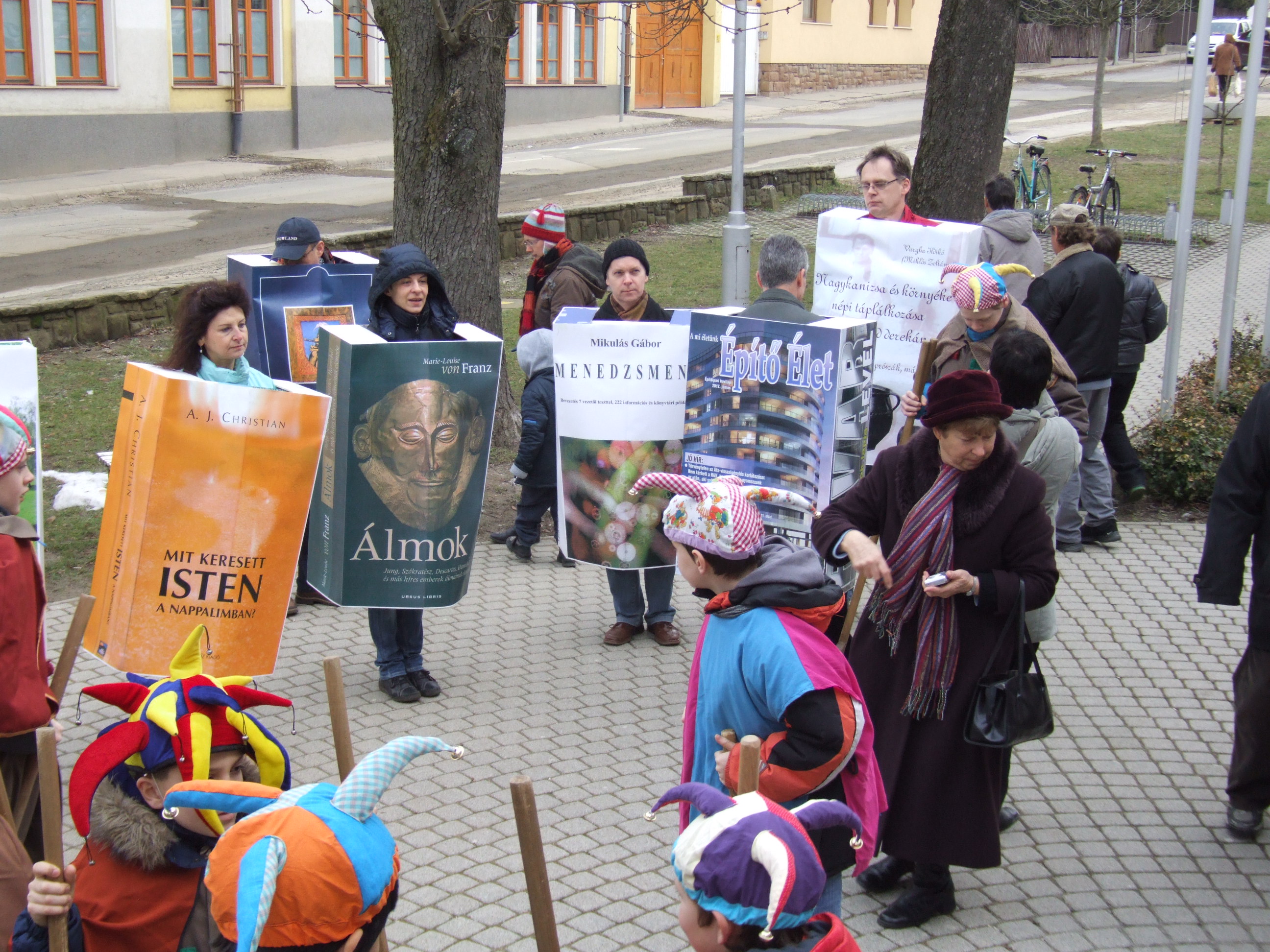 Nyilvános 1383 | 2984 | 2013. február 9. A farsangi fánkfesztiválra készülve felhívásban kértük olvasóinkat, hogy öltsék magukra kedves könyvüket. Egy „könyvespolcnyi” jelentkező vette magára kedves olvasmányát, az ő vonulásukról készültek ezek a képek. A környezetükben néhol láthatók a Nagykanizsai Gólyalábasok, akik szintén a könyvtárhoz kötődnek. A „felvonuló kötetek” a könyvtár épületében még megtekinthetők. | |