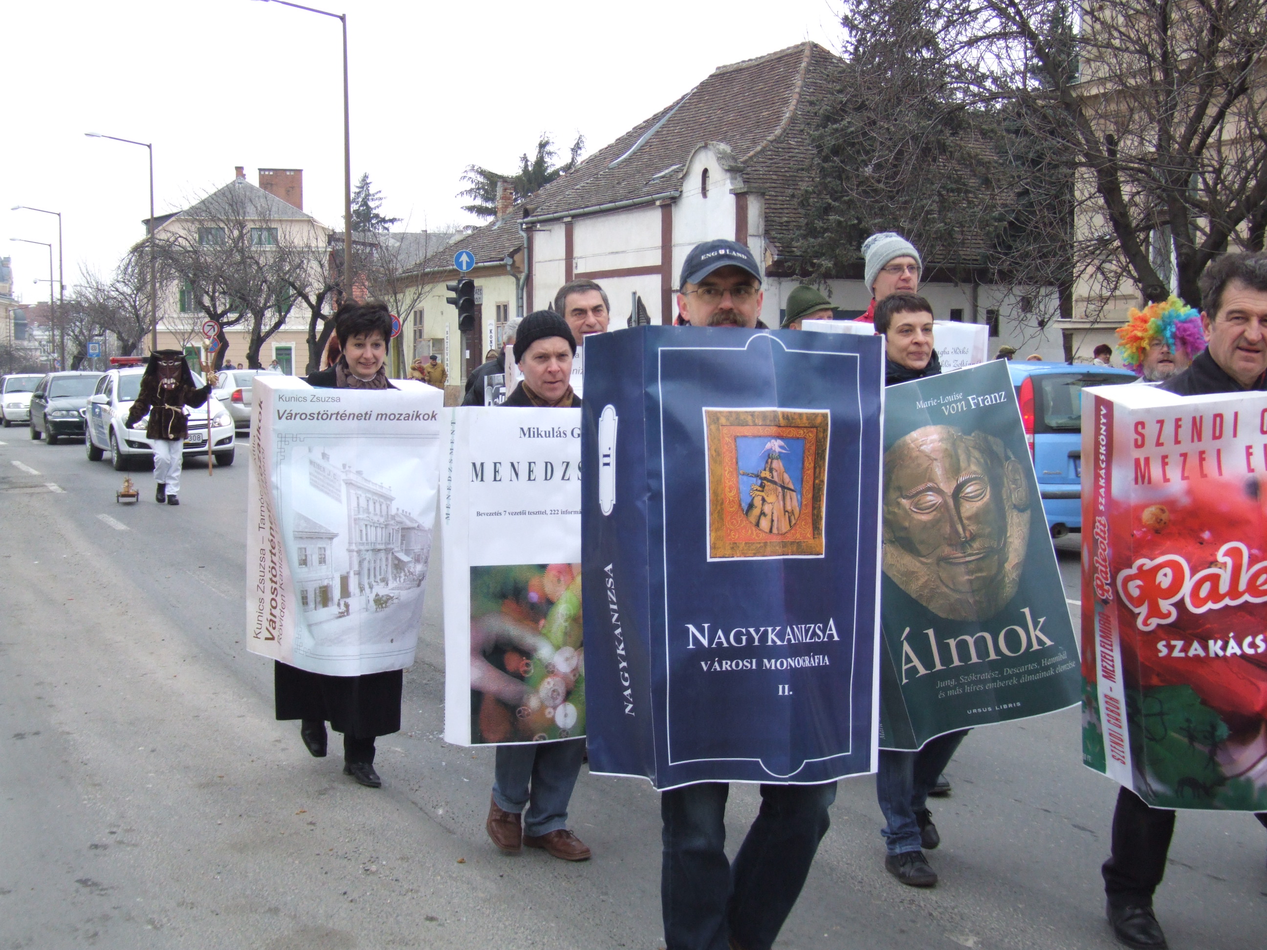 Nyilvános 992 | 1373 | 2013. február 9. A farsangi fánkfesztiválra készülve felhívásban kértük olvasóinkat, hogy öltsék magukra kedves könyvüket. Egy „könyvespolcnyi” jelentkező vette magára kedves olvasmányát, az ő vonulásukról készültek ezek a képek. A környezetükben néhol láthatók a Nagykanizsai Gólyalábasok, akik szintén a könyvtárhoz kötődnek. A „felvonuló kötetek” a könyvtár épületében még megtekinthetők. | |