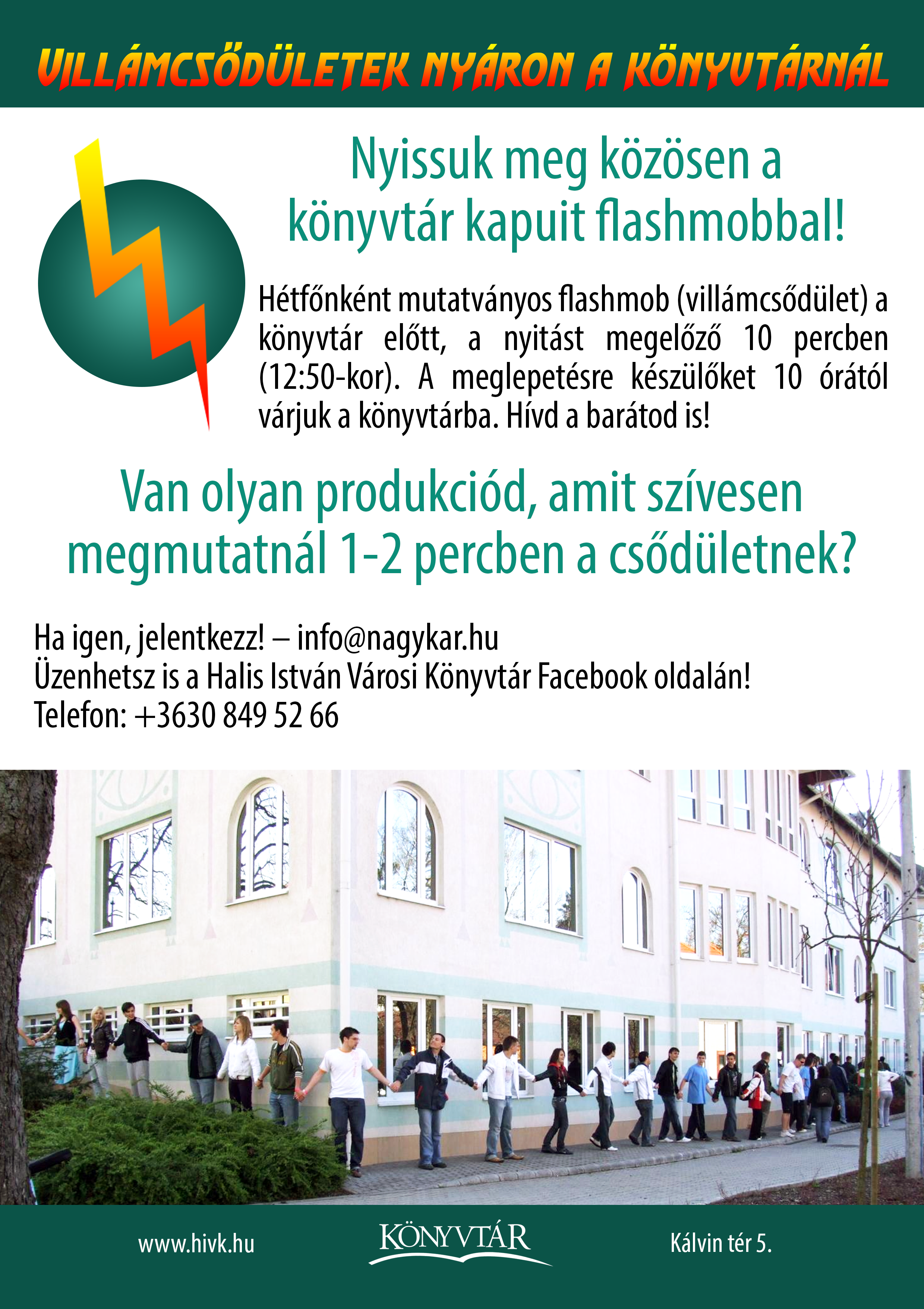 Nyilvános 1574 | 3695 | Villámcsődületek nyáron a könyvtárnál | Nyissuk meg közösen a könyvtár kapuit flashmobbal! Hétfőnként mutatványos flashmob (villámcsődület) a könyvtár előtt, a nyitást megelőző 10 percben (12:50-kor). A meglepetésre készülőket 10 órától várjuk a könyvtárba. Hívd a barátod is! Van olyan produkciód, amit szívesen megmutatnál 1-2 percben a csődületnek? Ha igen, jelentkezz! – info@nagykar.hu Üzenhetsz is a Halis István Városi Könyvtár Facebook oldalán! Telefon: +3630 849 52 66 www.hivk.hu Kálvin tér 5. |