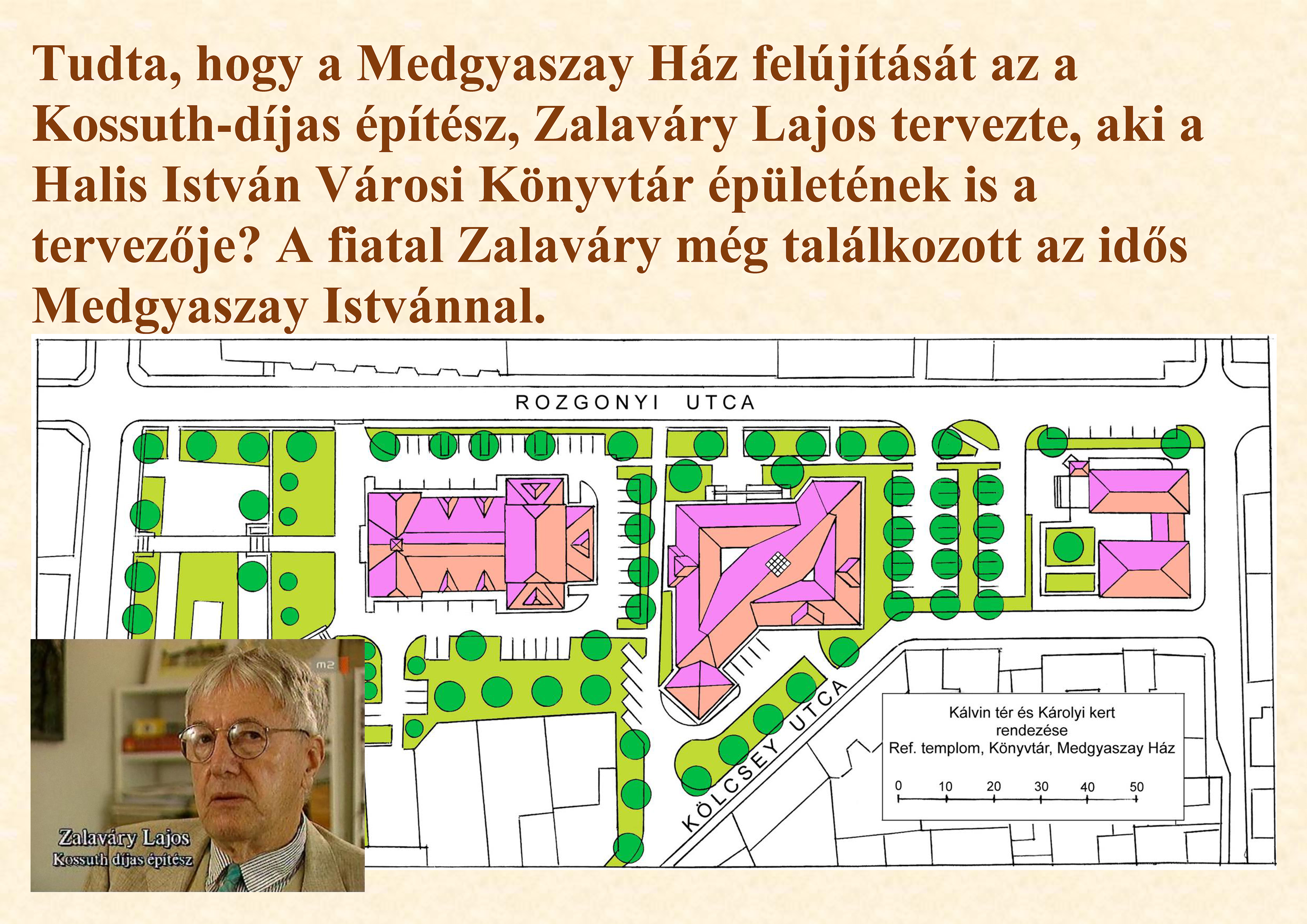 Nyilvános 1215 | 2221 | Rövid leírás | Teljes leírás (242 B) | Tudta, hogy a Medgyaszay Ház felújítását az a Kossuth-díjas építész, Zalaváry Lajos tervezte, aki a Halis István Városi Könyvtár épületének is a tervezője? A fiatal Zalaváry még találkozott az idős Medgyaszay Istvánnal. |
