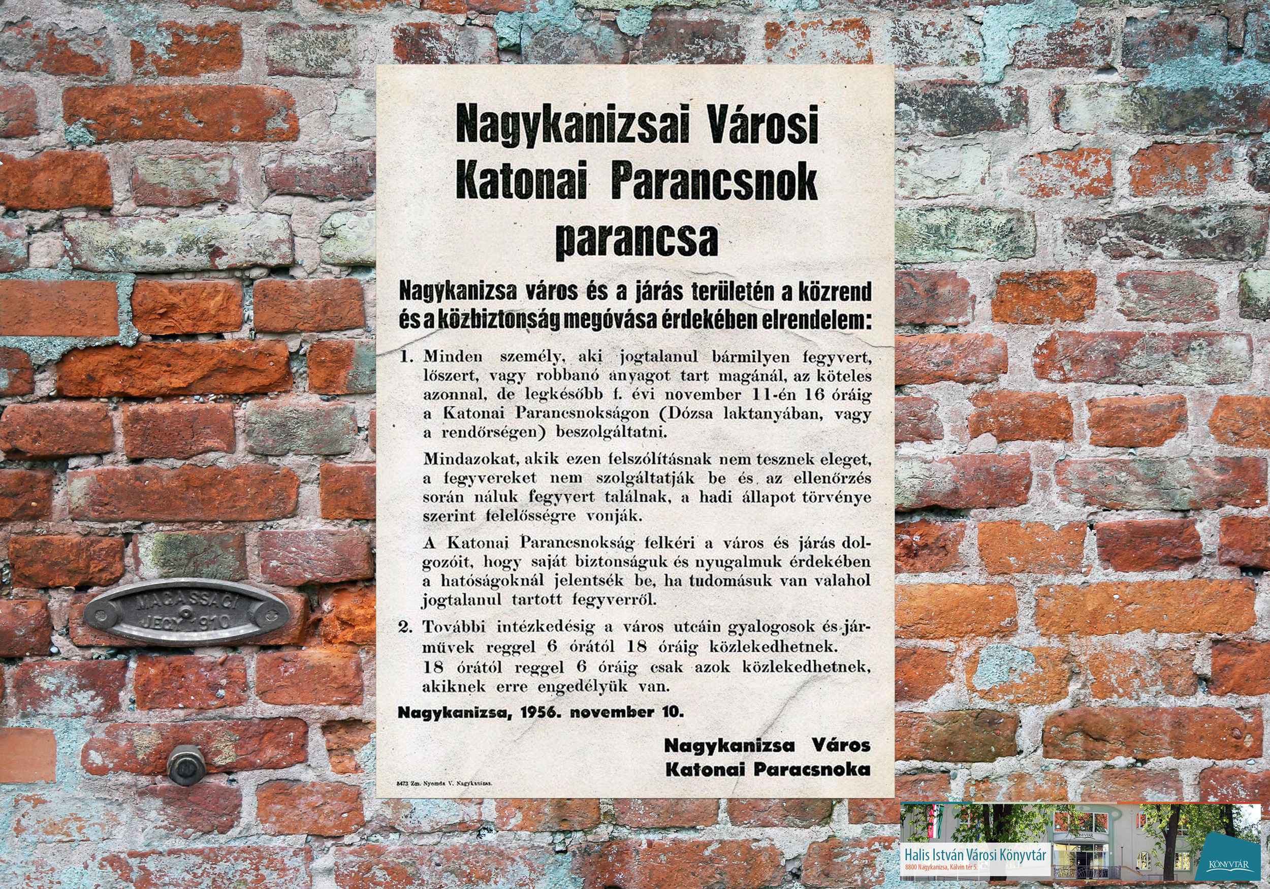 Nyilvános 1320 | 2162 | Az 1956-os forradalom leverése után | Október 23-i kiállításunk képei közül az időrendben következőt mutatjuk be. Az előző két szórólap a forradalmi szervek dokumentuma volt. Most egy falragasz következik, ez azonban már a forradalom leverése után készült. A szovjet csapatok 1956. november 5-én szállták meg Nagykanizsát, november 7-én el is hagyták a várost. A helyi katonai parancsnok ezek után tett közzé ezt az utasítását. Kattintson a képre! |