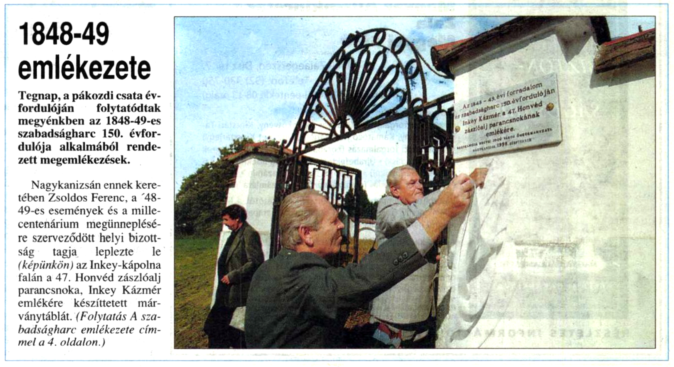 Nyilvános 1208 | 1842 | Zalai Hírlap 1998. szeptember 30. 229. szám 1. oldal | 1848-49 emlékezete Tegnap, a pákozdi csata évfordulóján folytatódtak megyénkben az 1848-49-es szabadságharc 150. évfordulója alkalmából rendezett megemlékezések. Nagykanizsán ennek keretében Zsoldos Ferenc, a ''48- 49-es események és a millecentenárium megünneplésére szerveződött helyi bizottság tagja leplezte le (képünkön) az Inkey-kápolna falán a 47. Honvéd zászlóalj parancsnoka, Inkey Kázmér emlékére készíttetett márványtáblát. (Folytatás A szabadságharc emlékezete címmel a 4. oldalon.) |